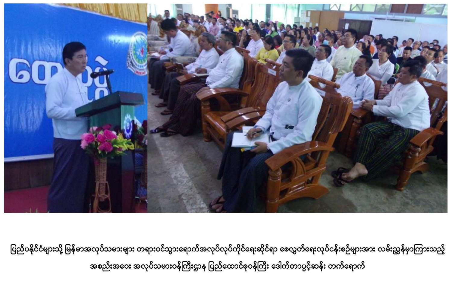 ပြည်ပနိုင်ငံများသို့ မြန်မာအလုပ်သမားများ တရားဝင်သွားရောက်အလုပ်လုပ်ကိုင်ရေးဆိုင်ရာ စေလွှတ်ရေး လုပ်ငန်းစဉ်များနှင့်စပ်လျဉ်းသည့် အစည်းအဝေးကို ယနေ့မွန်းလွဲပိုင်းတွင် ရန်ကုန်တိုင်းဒေသကြီး ဒဂုံမြို့သစ်(မြောက်ပိုင်း)မြို့နယ်ရှိ ကျွမ်းကျင်မှု လေ့ကျင့်ရေးသင်တန်း ကျောင်းအစည်းအဝေးခန်းမ၌ ကျင်းပသည်။