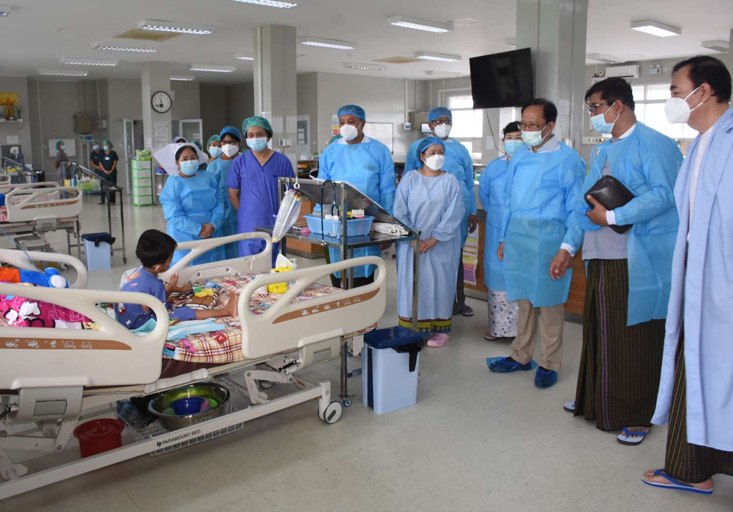 ဆက်လက်၍ ပြည်ထောင်စုဝန်ကြီးနှင့်အဖွဲ့သည် ရန်ကုန်တိုင်းဒေသကြီး ဒဂုံမြို့နယ်ရှိ ကလေးဆေးရုံကြီးသို့ သွားရောက်ကာ ဆေးရုံအတွင်း ဆေးကုသရေးလုပ်ငန်းများ ဆောင်ရွက်နေမှုကို လှည့်လည် ကြည့်ရှုစစ်ဆေးသည်။