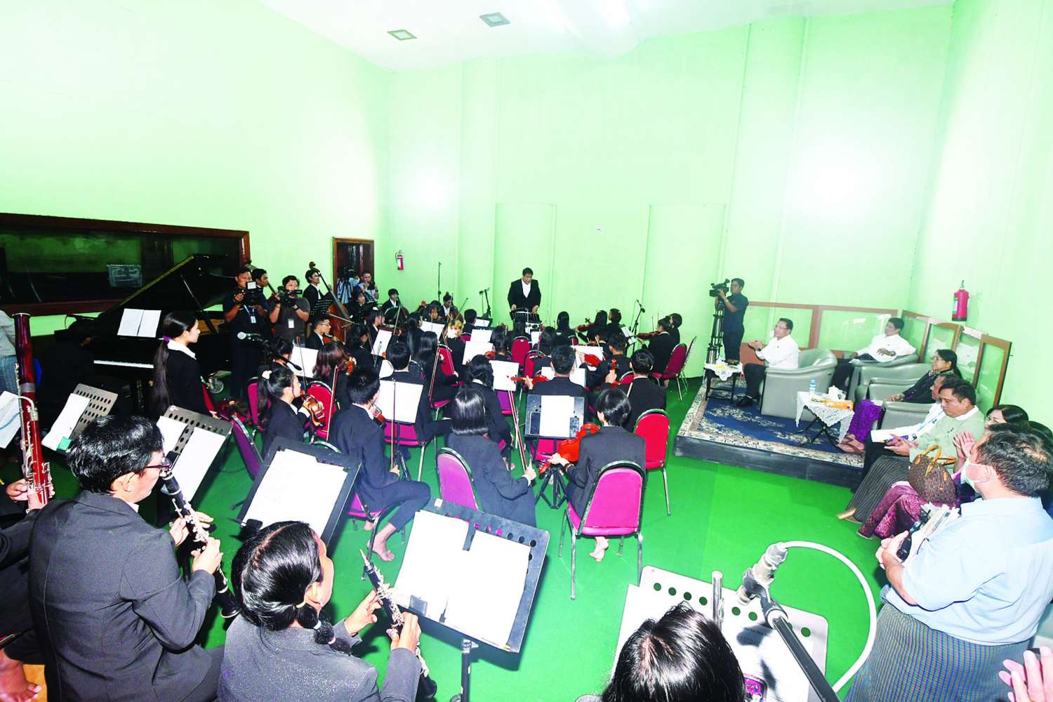 ရှေးဦးစွာ မြန်မာ့အသံနှင့်ရုပ်မြင်သံကြား(ရန်ကုန်) Studio (B)၌ မြန်မာ့အသံနှင့်ရုပ်မြင်သံကြား ညွှန်ကြားရေးမှူးချုပ်ဦးရဲနိုင်က သံစုံတီးဝိုင်းစုဖွဲ့ပြင်ဆင်လေ့ကျင့်နေမှုနှင့် ပြည်ထောင်စုဝန်ကြီး၏ လမ်းညွှန်မှာကြားချက်များအပေါ် ဆောင်ရွက်ပြီးစီးမှု အခြေအနေများကို ရှင်းလင်းတင်ပြသည်။