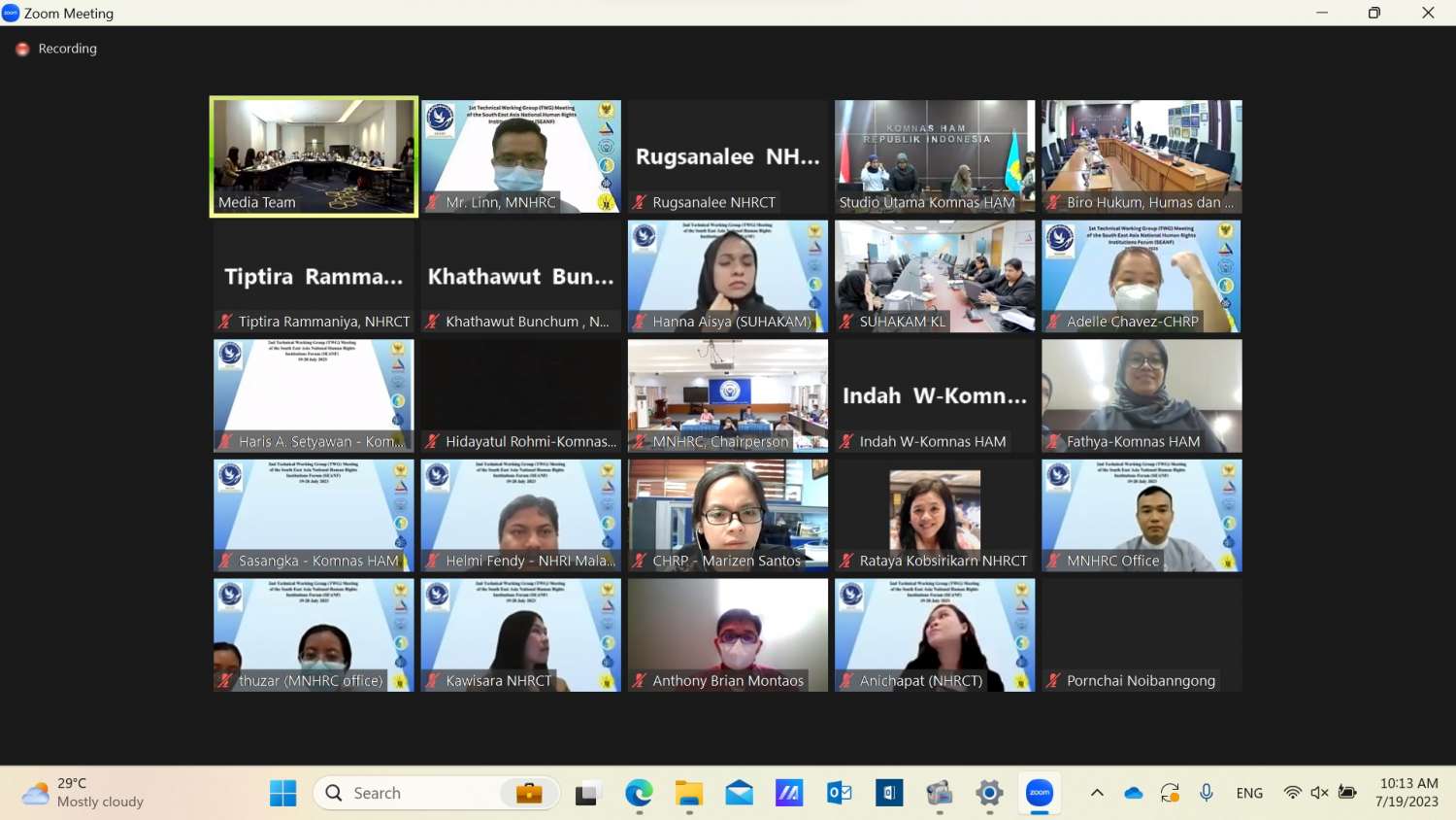 အစည်းအဝေးသို့ ဖိုရမ်အဖွဲ့ဝင်များဖြစ်ကြသည့် မလေးရှား၊ ဖိလစ်ပိုင်၊ ထိုင်းနှင့် တီမောလက်စ်တေနိုင်ငံ လူ့အခွင့်အရေးကော်မရှင်များမှ ကိုယ်စားလှယ်များက In-person တက်ရောက်ခဲ့ကြပြီး အင်ဒိုနီးရှားနိုင်ငံ အမျိုးသားလူ့အခွင့်အရေးကော်မရှင်မှ ကိုယ်စားလှယ်များနှင့် မြန်မာနိုင်ငံ အမျိုးသားလူ့အခွင့်အရေးကော်မရှင်ဥက္ကဋ္ဌ ဦးလှမြင့်၊ ဒုတိယဥက္ကဋ္ဌ ဒေါက်တာနန္ဒာမွှန်း၊ ကော်မရှင်အဖွဲ့ဝင် ဦးပေါ်လွင်စိန်၊ ဒေါက်တာသန်းမြင့်နှင့် ဒေါက်တာ တင်မောင်မောင်သန်း၊ ကော်မရှင်ရုံး ဒုတိယညွှန်ကြားရေးမှူးချုပ်၊ နိုင်ငံတကာဆက်ဆံရေးဌာန ညွှန်ကြားရေးမှူးနှင့် ဝန်ထမ်းများက video conferencing စနစ်ဖြင့် တက်ရောက်ခဲ့ကြသည်။