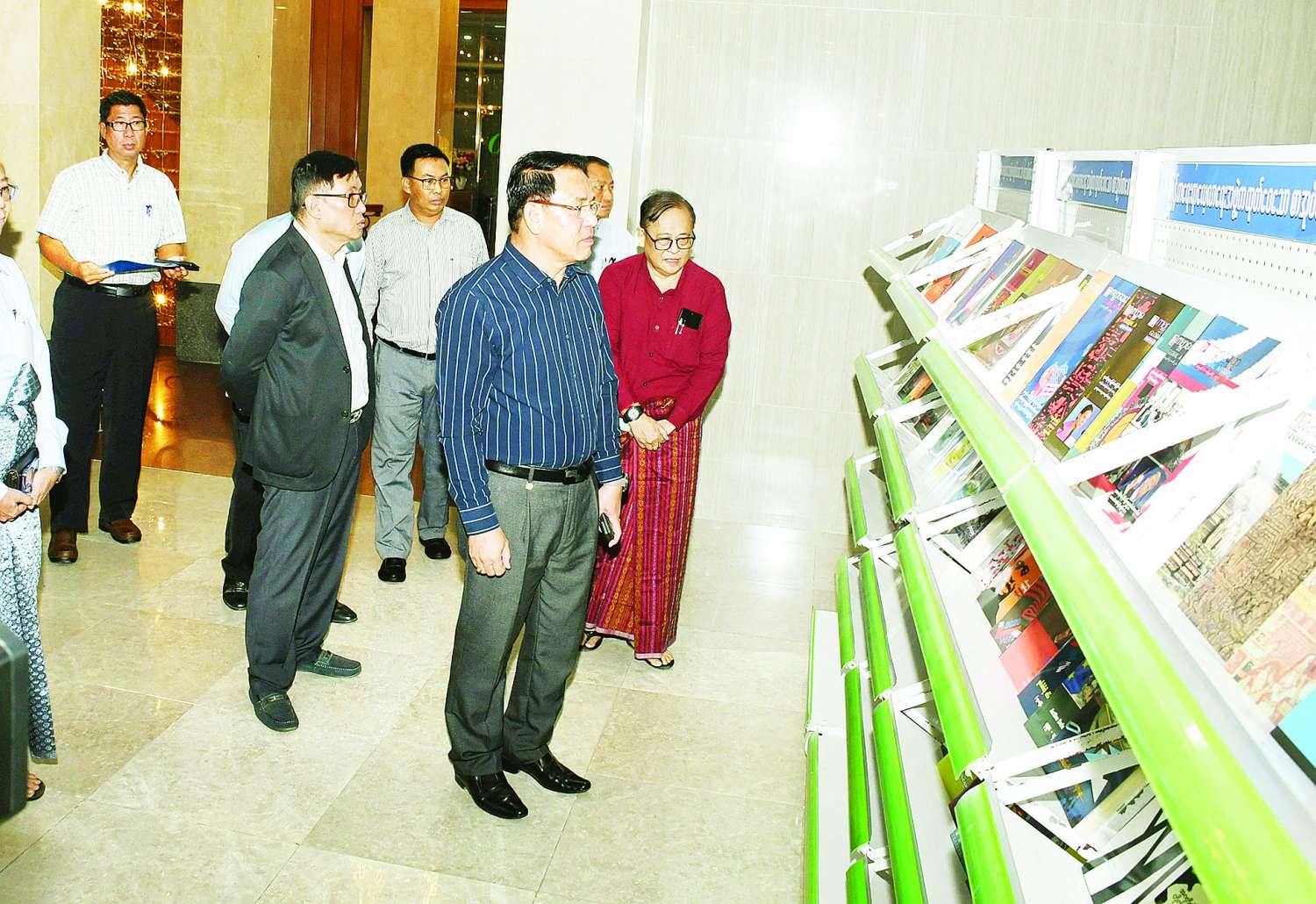 ရှေးဦးစွာ ပြည်ထောင်စုဝန်ကြီးနှင့် တက်ရောက်လာကြသည့် ဧည့်သည်တော်များကခင်းကျင်းပြသထားသည့် မြန်မာရေးရာအဖွဲ့ကထုတ်ဝေသော စာအုပ်စာစောင်များကို စိတ်ဝင်တစားကြည့်ရှု လေ့လာကြသည်။