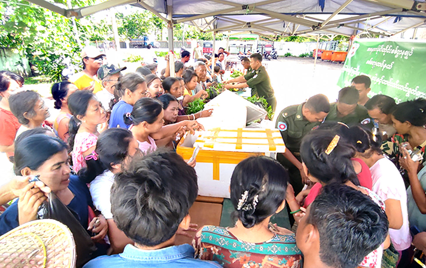 ဆိုင်ကလုန်းမုန်တိုင်း (မိုခါ)တိုက်ခတ်မှုကြောင့် မုန်တိုင်းဒဏ်သင့် ဒေသခံပြည်သူများနှင့် ဌာနဆိုင်ရာဝန်ထမ်းများ၏ စားသောက်ရေးအဆင်ပြေစေရန်နှင့် မိမိတို့အလိုရှိရာ စားသောက်ကုန်ပစ္စည်းများကို ဈေးနှုန်းသက်သာစွာဖြင့် ဝယ်ယူစားသောက်နိုင်ရေးအတွက် အနောက်ပိုင်းတိုင်းစစ်ဌာနချုပ် နယ်မြေခံတပ်မတော်သားများနှင့် တာဝန်ရှိသူများက နေ့စဉ်ရောင်းချပေးလျက်ရှိသည်။