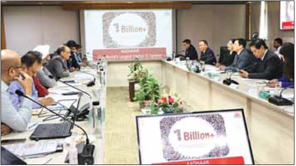 ဇူလိုင် ၂၅ ရက် နံနက်ပိုင်းတွင် ပြည်ထောင်စုဝန်ကြီးနှင့်အဖွဲ့သည် မြန်မာသံအမတ်ကြီး ဦးမိုးကျော် အောင်နှင့်အတူ နယူးဒေလီမြို့ရှိ အိန္ဒိယနိုင်ငံအစိုးရ၏ Unique Identification Authority of India (UIDAI) ရုံးချုပ်သို့ရောက်ရှိရာ အမှုဆောင်အရာရှိချုပ် Mr. Amit Agrawal နှင့် တာဝန်ရှိသူများက UIDAI ၏ ဖွဲ့စည်းတည်ထောင်ထားရှိမှု၊ Aadhaar စနစ်အောင်မြင်ရေးအတွက် လုပ်ငန်းအဆင့်အလိုက် ကြိုးပမ်းဆောင်ရွက်ခဲ့မှု၊ Aadhaar စနစ်ဖြင့်အစိုးရ၊ အဖွဲ့အစည်းအသီးသီးနှင့် ပြည်သူများအား ထိရောက်သော ဝန်ဆောင်မှုများပေးနေမှုအခြေအနေများကို Powerpoint ဖြင့် ရှင်းလင်းပြောကြားကြသည်။