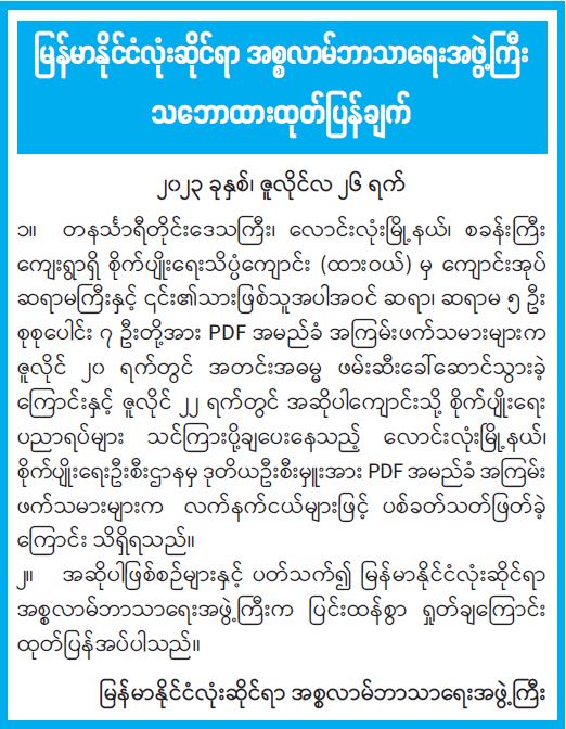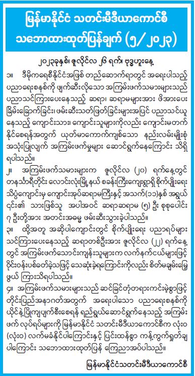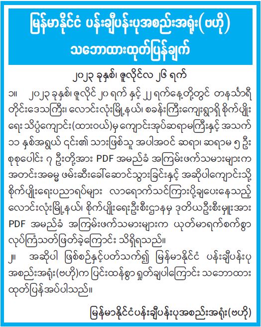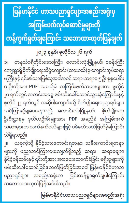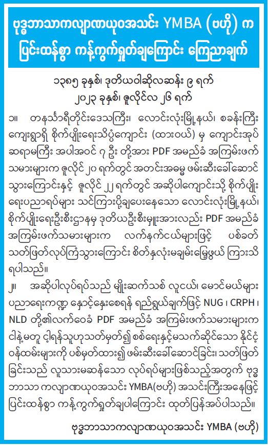 ယခုကဲ့သို့ လက်နက်တစ်စုံတစ်ရာကိုင်ဆောင်ထားခြင်းမရှိသော အနာဂတ်လူငယ်၊ မောင်မယ်များအား ပညာသင်ကြားပေးနေသူများအား ဖမ်းဆီးခေါ်ဆောင်ခြင်း၊ ရက်စက်ယုတ်မာစွာ သေနတ်ဖြင့် ပစ်ခတ်သတ်ဖြတ်ခဲ့မှုအပေါ် ဗုဒ္ဓဘာသာကလျာဏယုဝအသင်း YMBA(ဗဟို)၊ ဘာသာပေါင်းစုံ ချစ်ကြည်ညီညွတ်ရေးအဖွဲ့(ဗဟို)၊ မြန်မာနိုင်ငံသဘင်အစည်းအရုံး(ဗဟို)၊ မြန်မာနိုင်ငံသတင်းမီဒီယာကောင်စီ၊ မြန်မာနိုင်ငံစာရေးဆရာအသင်း၊ မြန်မာနိုင်ငံရုပ်ရှင်အစည်းအရုံး၊ မြန်မာနိုင်ငံ ပန်းချီပန်းပုအစည်းအရုံး(ဗဟို)၊ မြန်မာနိုင်ငံ ဟာသပညာရှင်များ အစည်းအရုံး၊ မြန်မာနိုင်ငံဂီတအစည်းအရုံး(ဗဟို)၊ ပိန္နဲကုန်းရခိုင်ဂျာမေဗလီ၊ ဘူးသီးတောင်မောင်တောဒေသဖွံ့ဖြိုးရေးအသင်း၊ မြန်မာနိုင်ငံလုံးဆိုင်ရာ တမီလ်ဟိန္ဒူဖောင်ဒေးရှင်း (ဗဟို)၊ မြန်မာနိုင်ငံလုံးဆိုင်ရာ ဟိန္ဒူဘာသာရေးဗဟိုအဖွဲ့ချုပ်၊ သနန္တနဓမ္မပါလက(ဟိန္ဒူ)အဖွဲ့ချုပ်၊ မြန်မာနိုင်ငံလုံးဆိုင်ရာအစ္စလာမ်ဘာသာရေးအဖွဲ့ကြီး၊ ပြည်ထောင်စုမြန်မာနိုင်ငံ မက်သဒစ်အသင်းတော် (အောက်မြန်မာပြည်)နှင့် မြန်မာနိုင်ငံဧဝံဂေလိခရစ်ယာန်မဟာမိတ်အဖွဲ့ချုပ်တို့မှ ပြင်းထန်စွာကန့်ကွက်ရှုတ်ချပါကြောင်း သဘောထားများ အသီးသီးထုတ်ပြန်ခဲ့ကြကြောင်း သတင်းရရှိသည်။