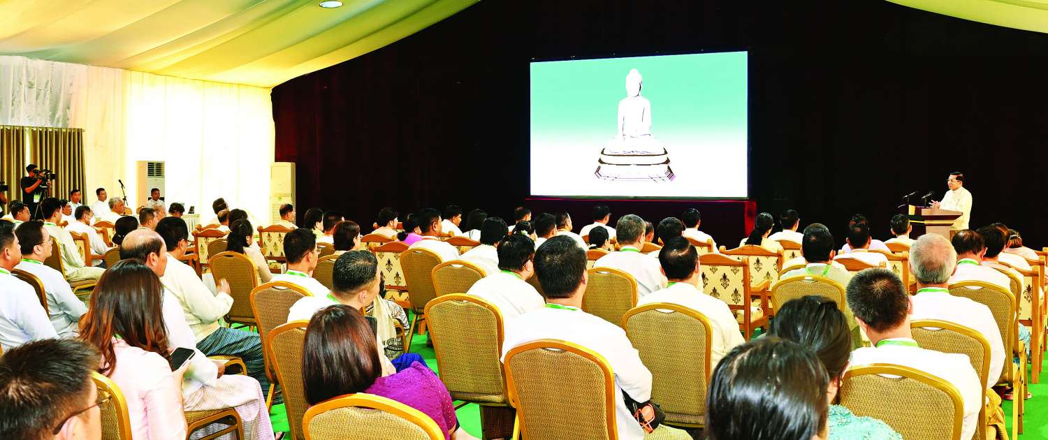 ထို့နောက် အခမ်းအနား တက်ရောက်လာကြသူများသည် မာရဝိဇယဘုရားကြီးနှင့် ဗုဒ္ဓဥယျာဉ် ပုံစံငယ်များ၊ ပိဋကတ် ကျမ်းစာအုပ်များကို ပါဠိအက္ခရာ နှင့် Romanize Language တို့ဖြင့် ရိုက်နှိပ်ထားမှုနှင့် Tablet များအတွင်း ထည့်သွင်းထားရှိမှုများကို ကြည့်ရှုကြပြီး ဦးဆောင်ဘုရား ဒါယကာ နိုင်ငံတော်စီမံအုပ်ချုပ် ရေးကောင်စီဥက္ကဋ္ဌ နိုင်ငံတော်ဝန်ကြီးချုပ်က တည်ထားကိုးကွယ် မှုအခြေအနေများနှင့် ပတ်သက်၍ ရှင်းလင်းပြောကြားသည်။