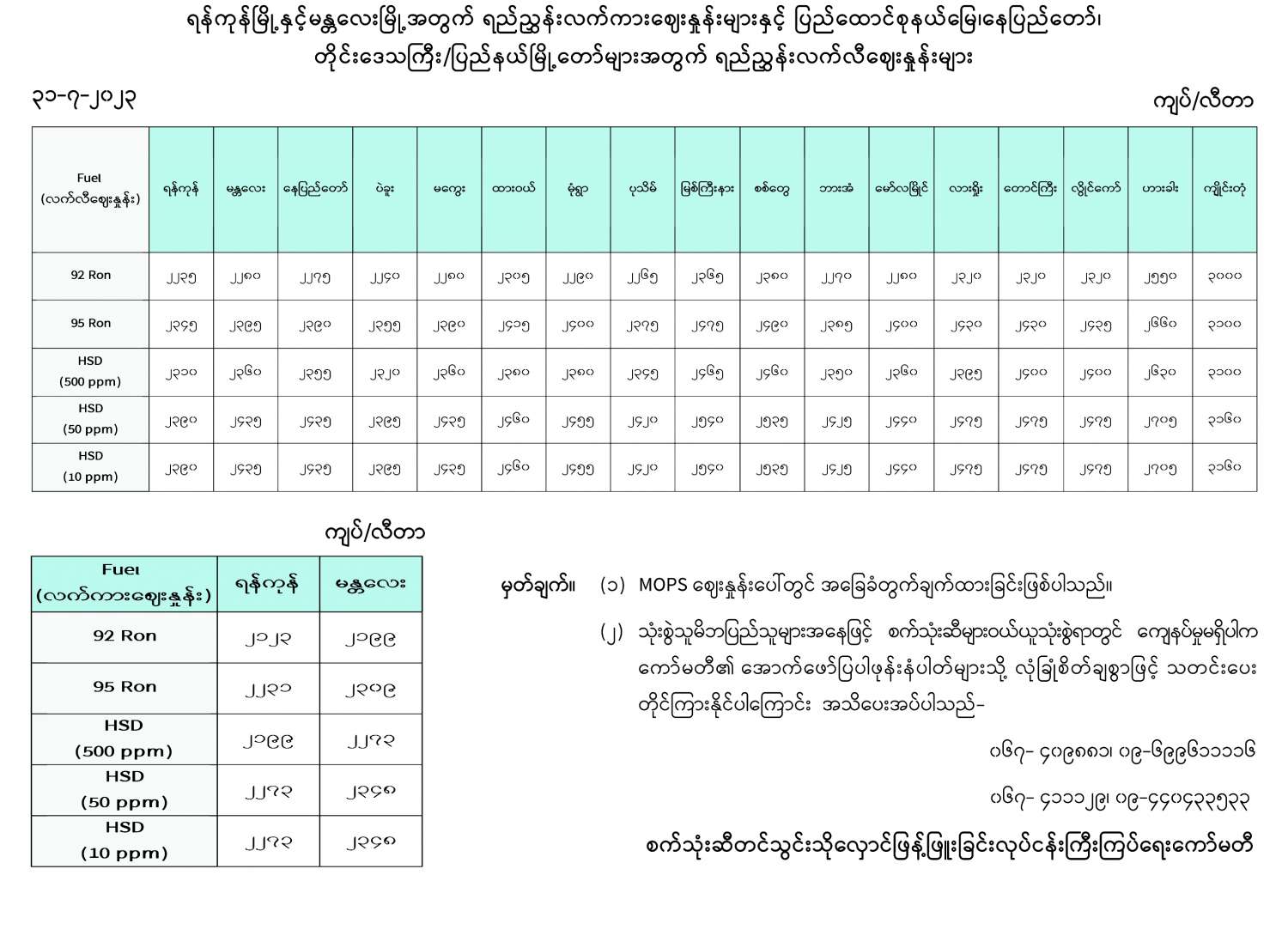 ရန်ကုန်မြို့နှင့် မန္တလေးမြို့အတွက် ရည်ညွှန်းလက်ကားဈေးနှုန်းများနှင့် ပြည်ထောင်စုနယ်မြေ နေပြည်တော်၊ တိုင်းဒေသကြီး/ပြည်နယ် မြို့တော်များအတွက် ရည်ညွှန်းလက်လီဈေးနှုန်းများ 07/31/2023
