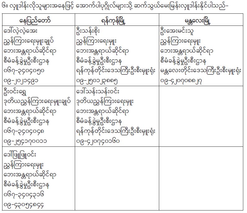 ၁။ မြန်မာနိုင်ငံတွင် ၁၄-၅-၂၀၂၃ ရက်နေ့တွင် ဖြစ်ပွားခဲ့သည့် အလွန့်အလွန်အားကောင်းသော ဆိုင်ကလုန်းမုန်တိုင်းမိုခါကြောင့် ဘေးသင့်ပြည်သူများအတွက် ပါဝင်လှူဒါန်းလိုသော စေတနာရှင်ပြည်သူများအနေဖြင့် မြန်မာကျပ်ငွေစာရင်းအမှတ် OA -011834 နှင့် နိုင်ငံခြားငွေစာရင်းအမှတ် 1DA- 0300086 သို့ ထည့်ဝင်လှူဒါန်းနိုင်ကြောင်း ကြေညာခဲ့ပါသည်။