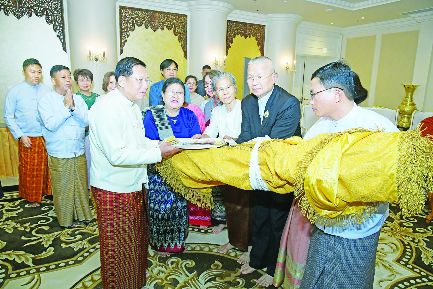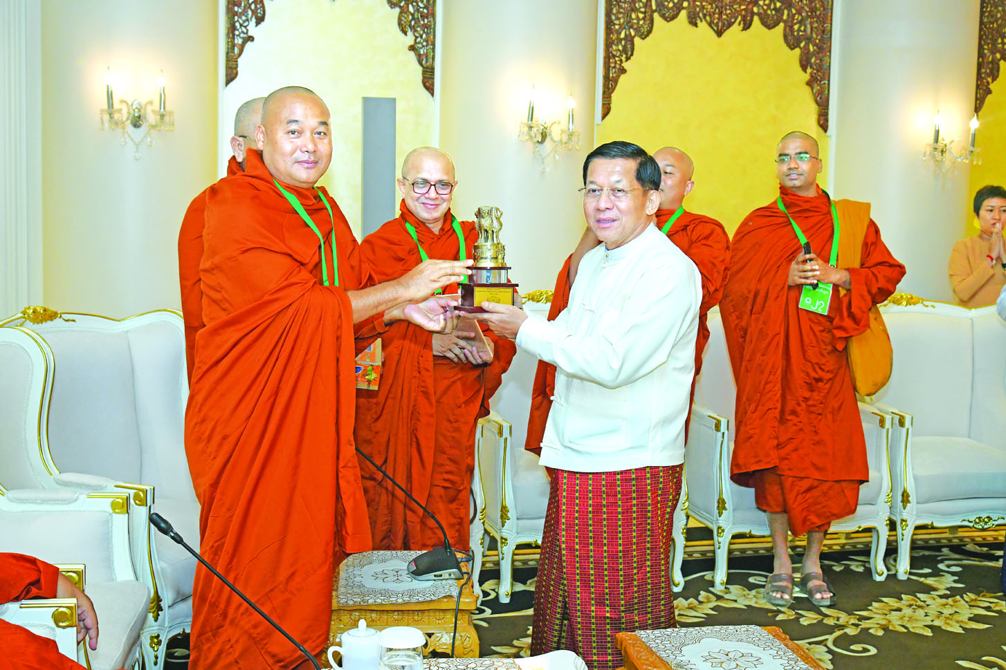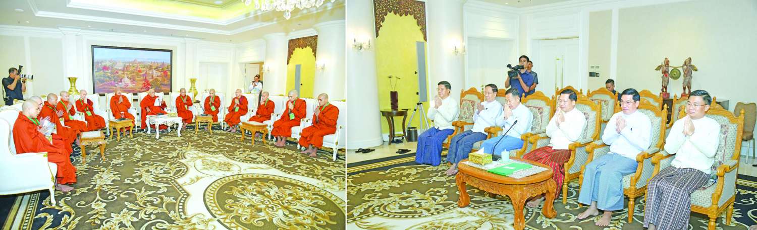 ဦးစွာ ဦးဆောင်ဘုရားဒါယကာ နိုင်ငံတော်စီမံအုပ်ချုပ်ရေးကောင်စီဥက္ကဋ္ဌ နိုင်ငံတော်ဝန်ကြီးချုပ်၊ နိုင်ငံတော်စီမံအုပ်ချုပ်ရေးကောင်စီ ဒုတိယဥက္ကဋ္ဌ ဒုတိယဝန်ကြီးချုပ်နှင့် အဖွဲ့ဝင်များအား နိုင်ငံတော် ဩဝါဒါစရိယ သောဠသမ ရွှေကျင်သာသနာပိုင် ဆရာတော်၊ သီတဂူကမ္ဘာ့ဗုဒ္ဓတက္ကသိုလ်များ၏အဓိပတိ အဘိဓဇမဟာရဋ္ဌဂုရု အဘိဓဇ အဂ္ဂမဟာသဒ္ဓမ္မဇောတိကဒေါက်တာ ဘဒ္ဒန္တ ဉာဏိဿရနှင့် အပြည်ပြည်ဆိုင်ရာ ထေရဝါဒဗုဒ္ဓသာသနာပြု တက္ကသိုလ်ပါမောက္ခချုပ် အဂ္ဂမဟာသဒ္ဓမ္မဇောတိကဓဇမဟာ ဂန္ထဝါစကပဏ္ဍိတ အဂ္ဂမဟာပဏ္ဍိတ မဟာဓမ္မကထိက ဗဟုဇနဟိတဓရ ဘဒ္ဒန္တဆေကိန္ဒတို့က နိုင်ငံအသီးသီးမှ ကြွရောက်လာကြသည့် ဆရာတော်ကြီးများနှင့်တစ်နိုင်ငံချင်း သီးခြားစီတွေ့ဆုံ မိတ်ဆက်ပေးသည်။