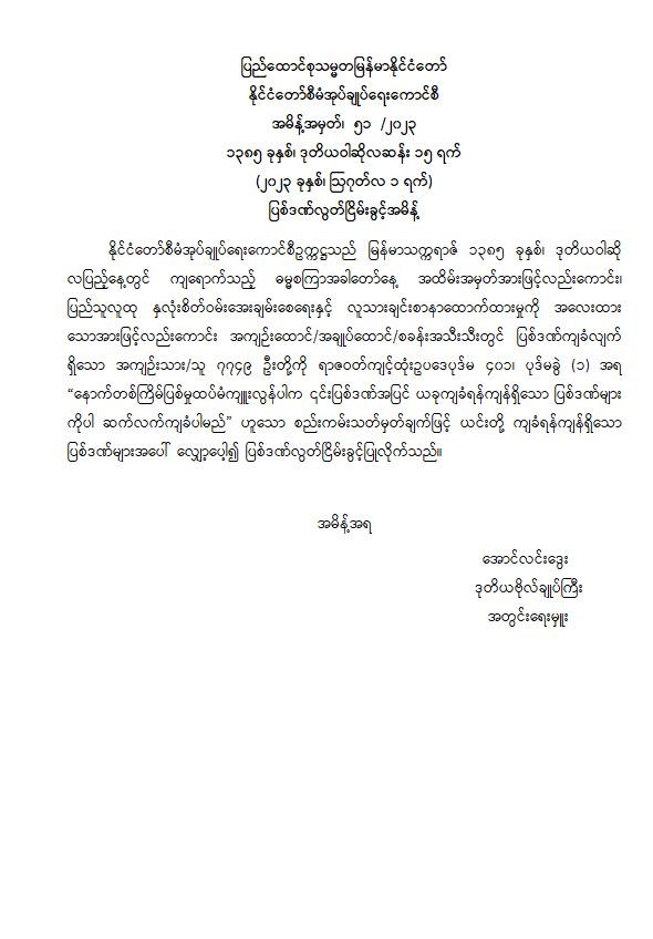 ပြစ်ဒဏ်လွတ်ငြိမ်းခွင့်အမိန့် 08/01/2023 ပြည်ထောင်စုသမ္မတမြန်မာနိုင်ငံတော် နိုင်ငံတော်စီမံအုပ်ချုပ်ရေးကောင်စီ အမိန့်အမှတ်၊ ၅၁ /၂၀၂၃ ၁၃၈၅ ခုနှစ်၊ ဒုတိယဝါဆိုလဆန်း ၁၅ ရက် (၂၀၂၃ ခုနှစ်၊ ဩဂုတ်လ ၁ ရက်) ပြစ်ဒဏ်လွတ်ငြိမ်းခွင့်အမိန့်
