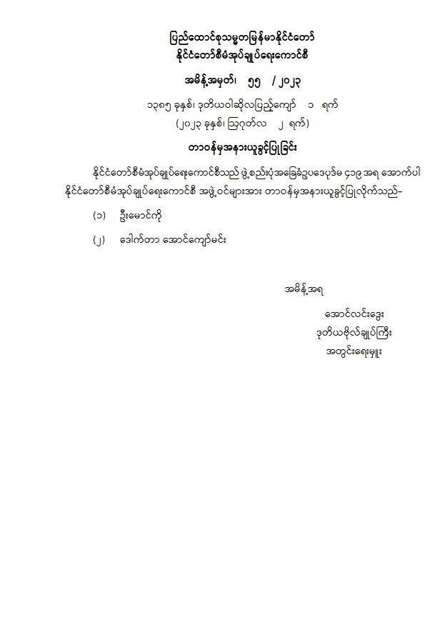 ပြည်ထောင်စုသမ္မတမြန်မာနိုင်ငံတော် နိုင်ငံတော်စီမံအုပ်ချုပ်ရေးကောင်စီ အမိန့်အမှတ်၊ ၅၅ / ၂၀၂၃ ၁၃၈၅ ခုနှစ်၊ ဒုတိယဝါဆိုလပြည့်ကျော် ၁ ရက် (၂၀၂၃ ခုနှစ်၊ ဩဂုတ်လ ၂ ရက်) တာဝန်မှအနားယူခွင့်ပြုခြင်း 08/02/2023