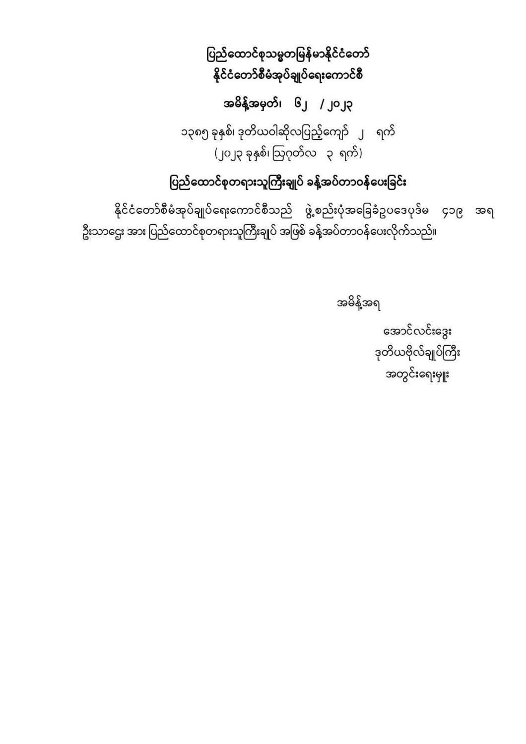 ပြည်ထောင်စုတရားသူကြီးချုပ် ခန့်အပ်တာဝန်ပေးခြင်း 08/04/2023 ပြည်ထောင်စုသမ္မတမြန်မာနိုင်ငံတော် နိုင်ငံတော်စီမံအုပ်ချုပ်ရေးကောင်စီ အမိန့်အမှတ်၊ ၆၂ / ၂၀၂၃ ၁၃၈၅ ခုနှစ်၊ ဒုတိယဝါဆိုလပြည့်ကျော် ၂ ရက် (၂၀၂၃ ခုနှစ်၊ ဩဂုတ်လ ၃ ရက်) ပြည်ထောင်စုတရားသူကြီးချုပ် ခန့်အပ်တာဝန်ပေးခြင်း