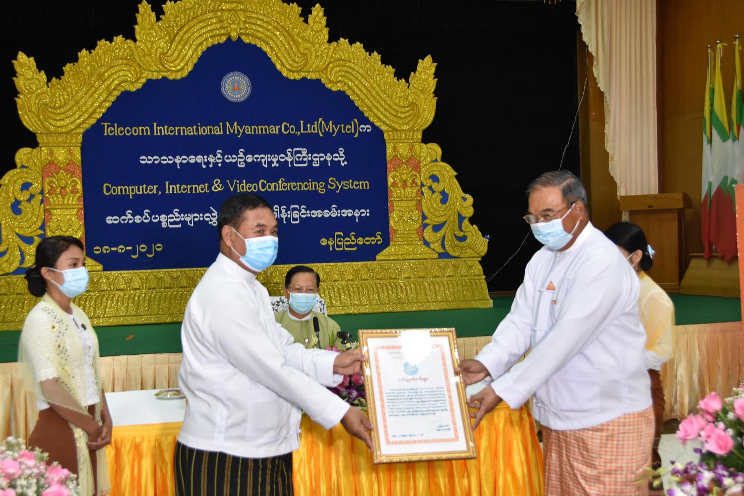 ယင်းနောက် E-Government စနစ်ဖော်ဆောင်ရန် သာသနာရေးနှင့် ယဉ်ကျေးမှုဝန်ကြီးဌာန (နေပြည်တော်/ ရန်ကုန်ရုံးခွဲ)၊ နိုင်ငံတော်ပရိယတ္တိသာသနာ့တက္ကသိုလ် (မန္တလေး)နှင့် အမျိုးသားယဉ်ကျေးမှုနှင့် အနုပညာတက္ကသိုလ် (ရန်ကုန်/မန္တလေး) တို့တွင် အသုံးပြုရန်အတွက် Video Conferencing System (၆) နေရာနှင့် Fiber Optic Cable နှင့် သာသနာရေးနှင့်ယဉ်ကျေးမှုဝန်ကြီးဌာန (ဝန်ကြီးရုံး) သို့ Laptop ကွန်ပျူတာ အလုံး (၅၀)၊ အင်တာနက် (၁၆၀) Mbps အပါအဝင် စုစုပေါင်းငွေကျပ် ၂၀၃၅ သိန်းတန်ဖိုးရှိသည့် နည်းပညာဆိုင်ရာ ဆက်စပ်ပစ္စည်းများကို လွှဲပြောင်းပေးအပ်လှူဒါန်းရာ သာသနာရေးနှင့် ယဉ်ကျေးမှုဝန်ကြီးဌာန ဒုတိယဝန်ကြီး ဦးကြည်မင်းက လက်ခံရယူ၍ ဂုဏ်ပြုမှတ်တမ်းလွှာ ပြန်လည်ပေးအပ်သည်။