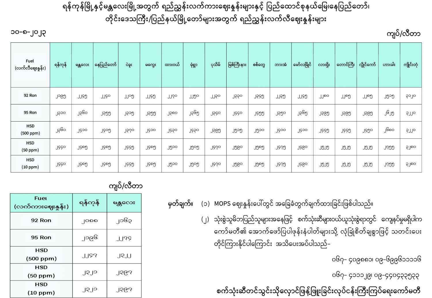 ရန်ကုန်မြို့နှင့် မန္တလေးမြို့အတွက် ရည်ညွှန်းလက်ကားဈေးနှုန်းများနှင့် ပြည်ထောင်စုနယ်မြေ နေပြည်တော်၊ တိုင်းဒေသကြီး/ပြည်နယ် မြို့တော်များအတွက် ရည်ညွှန်းလက်လီဈေးနှုန်းများ 08/10/2023