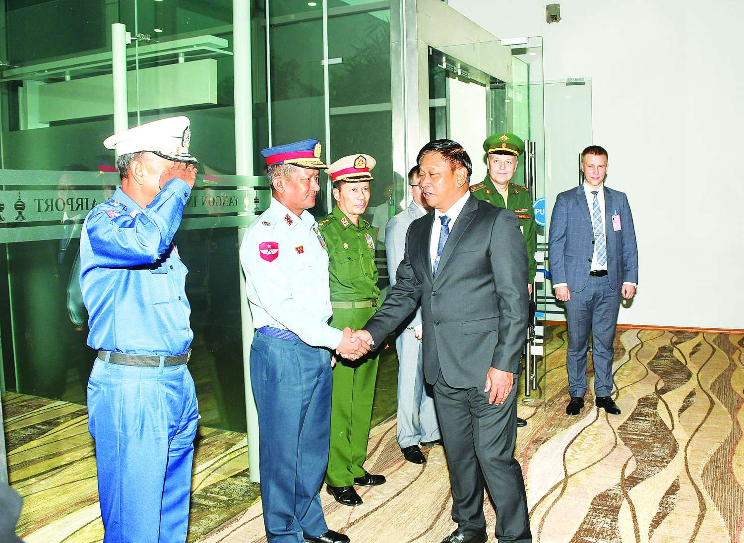 ဒုတိယဝန်ကြီးချုပ်နှင့် ပြည်ထောင်စုဝန်ကြီး ဗိုလ်ချုပ်ကြီးတင်အောင်စန်းဦးဆောင်သော ကိုယ်စားလှယ်အဖွဲ့အား ရန်ကုန်တိုင်းဒေသကြီး ဝန်ကြီးချုပ်ဦးစိုးသိန်း၊ တပ်မတော်အရာရှိကြီးများ၊ မြန်မာနိုင်ငံဆိုင်ရာ ရုရှားဖက်ဒရေးရှင်းနိုင်ငံသံရုံးမှ Counsellor ဖြစ်သူ Mr. Pavel KLABUKOVနှင့် တာဝန်ရှိသူများက ရန်ကုန်အပြည်ပြည်ဆိုင်ရာလေဆိပ်၌ လိုက်လံပို့ဆောင် နှုတ်ဆက်ခဲ့ကြသည်။