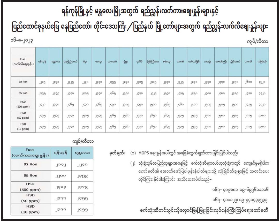 ရန်ကုန်မြို့နှင့် မန္တလေးမြို့အတွက် ရည်ညွှန်းလက်ကားဈေးနှုန်းများနှင့် ပြည်ထောင်စုနယ်မြေ နေပြည်တော်၊ တိုင်းဒေသကြီး/ပြည်နယ်မြို့တော်များအတွက် ရည်ညွှန်းလက်လီဈေးနှုန်းများ 08/16/2023