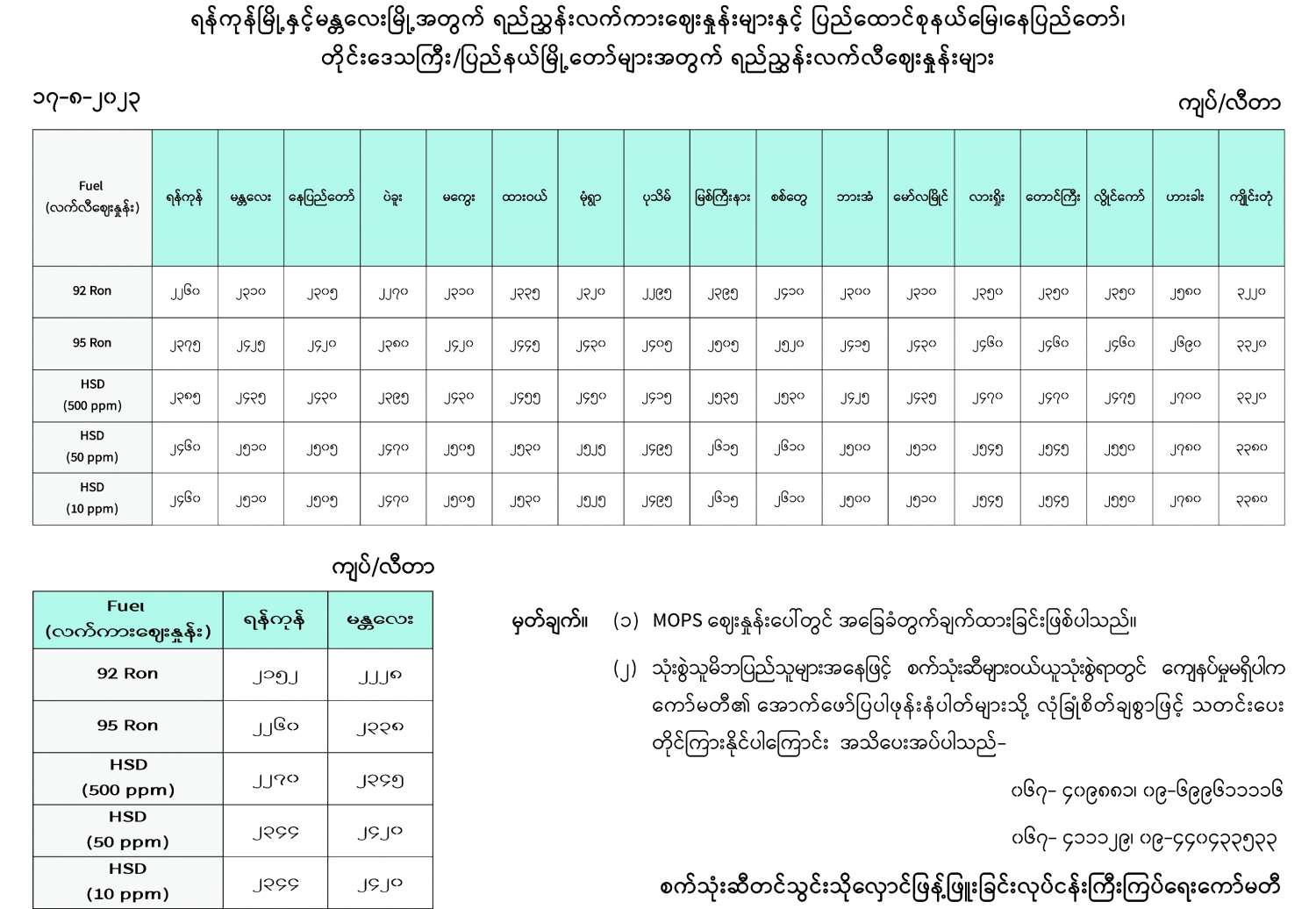 ရန်ကုန်မြို့နှင့် မန္တလေးမြို့အတွက် ရည်ညွှန်းလက်ကားဈေးနှုန်းများနှင့် ပြည်ထောင်စုနယ်မြေ နေပြည်တော်၊ တိုင်းဒေသကြီး/ပြည်နယ် မြို့တော်များအတွက် ရည်ညွှန်းလက်လီဈေးနှုန်းများ 08/17/2023