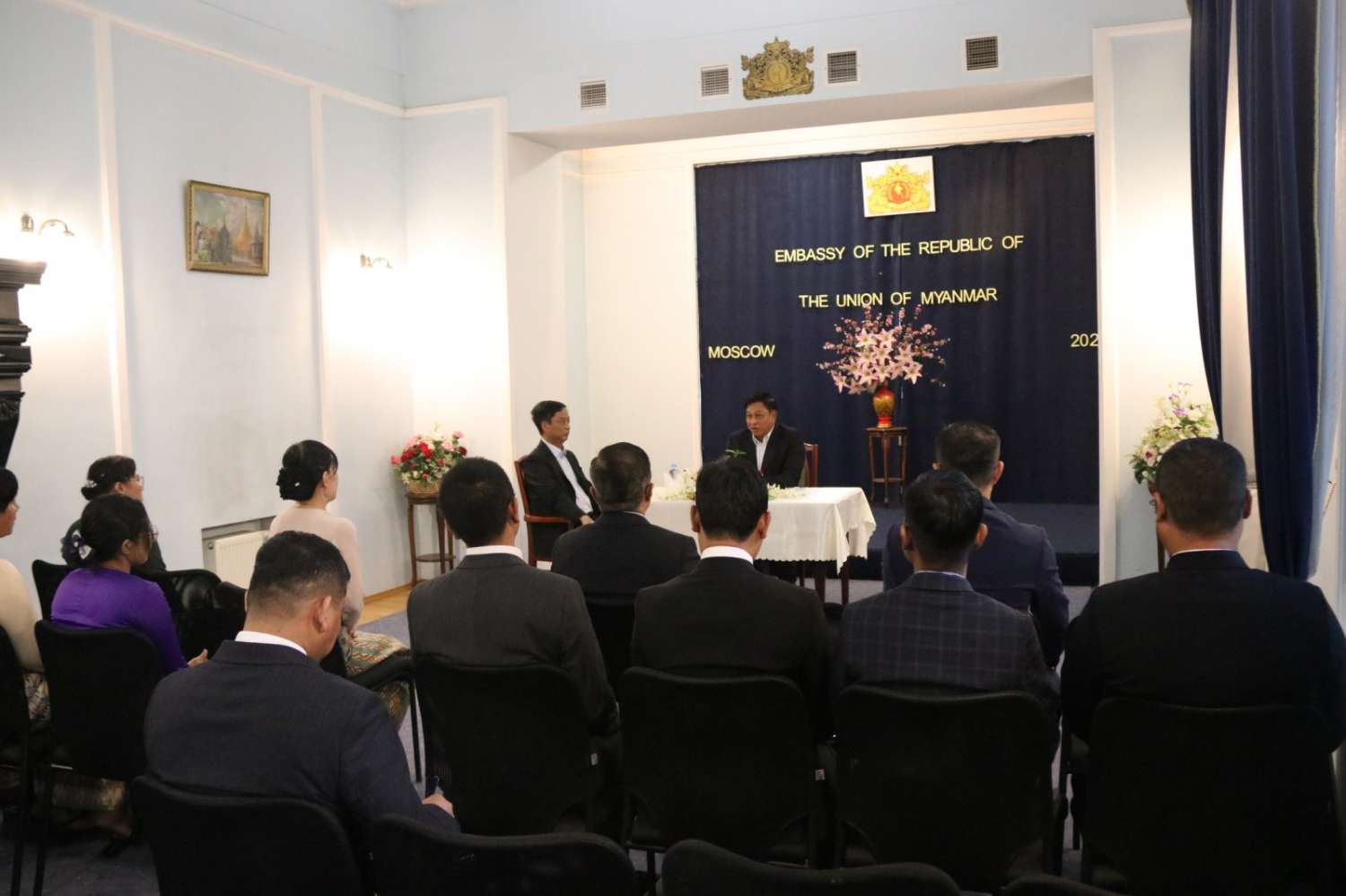 ၁၆-၈-၂၀၂၃ ရက်တွင် နိုင်ငံတကာစစ်ဘက်နည်းပညာဖိုရမ် (ARMY 2023) ကျင်းပရာ မျိုးချစ်ပန်းခြံ (Patriot Park) အတွင်း ခင်းကျင်းပြသထားသည့် စစ်ဘက်သုံး ယာဉ်/လက်နက်နှင့် အထောက်အကူပစ္စည်းများအား လိုက်လံကြည့်ရှုခဲ့ပြီး PJSC (UAC)၊ Technodinamika နှင့် Rosobomexport ကုမ္ပဏီတို့မှတာဝန်ရှိသူများနှင့် တွေ့ဆုံဆွေးနွေးခဲ့ပါသည်။ ညနေပိုင်းတွင် မြန်မာစစ်သံရုံးသို့ရောက်ရှိပြီး သံအမတ်ကြီး၊ စစ်သံမှူး(ကြည်း၊ ရေ၊ လေ)နှင့် စစ်သံရုံးမှ အရာရှိ၊ စစ်သည်၊ မိသားစုများနှင့်တွေ့ဆုံ၍ နိုင်ငံတော်၏ လက်ရှိဖြစ်ပေါ်တိုးတက်မှု အခြေအနေများကို ရှင်းလင်းပြောကြားပြီး စစ်သံရုံးမိသားစုများအတွက် လက်ဆောင်ပစ္စည်းများကို ပေးအပ်ခဲ့ပါသည်။