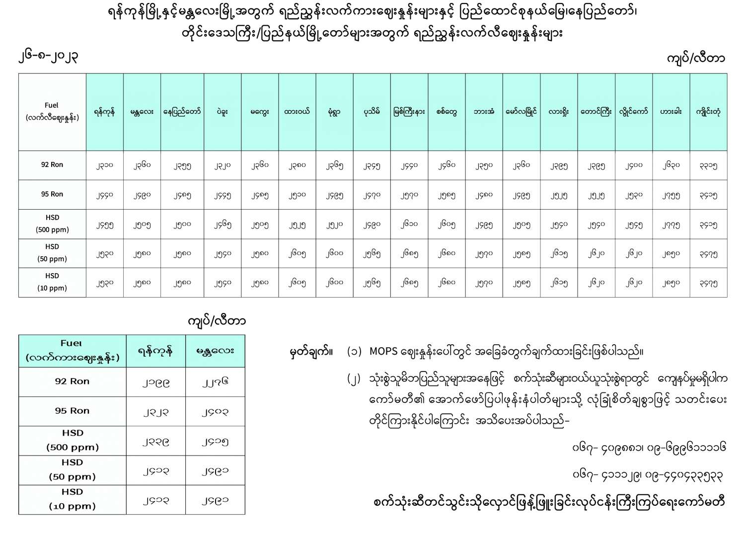 ရန်ကုန်မြို့နှင့် မန္တလေးမြို့အတွက် ရည်ညွှန်းလက်ကားဈေးနှုန်းများနှင့် ပြည်ထောင်စုနယ်မြေ နေပြည်တော်၊ တိုင်းဒေသကြီး/ပြည်နယ် မြို့တော်များအတွက် ရည်ညွှန်းလက်လီဈေးနှုန်းများ 08/26/2023