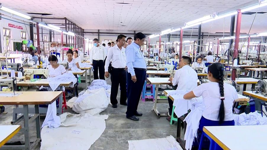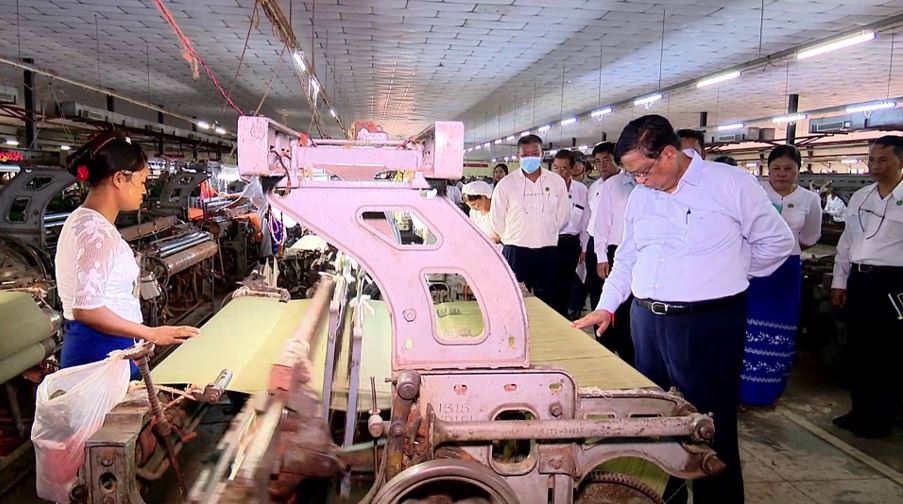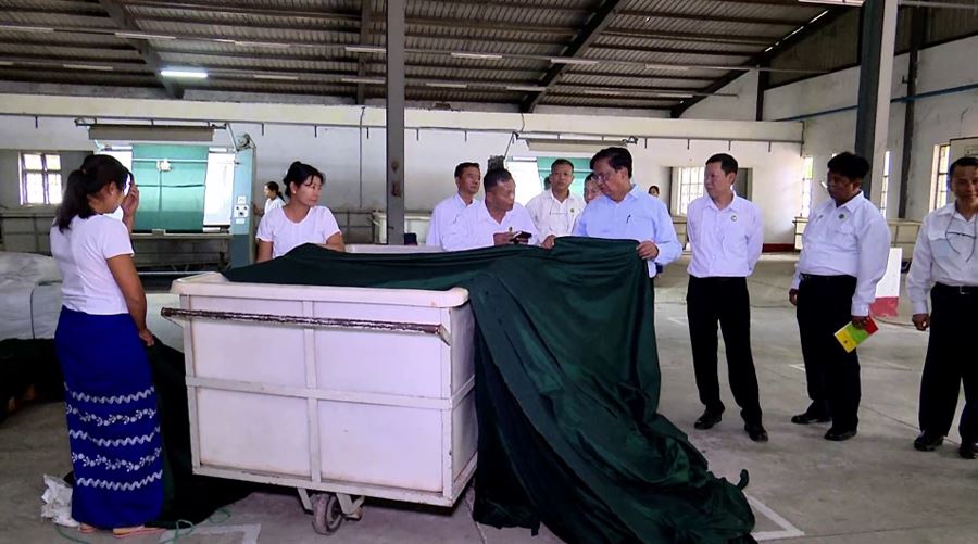 ကြည့်ရှုစစ်ဆေးစဉ် စက်ရုံအစည်းအဝေးခန်းမ၌ စက်ရုံမှူးနှင့် တာဝန်ရှိသူများက လုပ်ငန်းဆောင်များဆောင်ရွက်နေမှုကို ရှင်းလင်းတင်ပြရာ ပြည်ထောင်စုဝန်ကြီးက နိုင်ငံတော်အနေဖြင့် အသေးစား၊ အငယ်စားနှင့် အလတ်စား စီးပွားရေးလုပ်ငန်းများ ဖွံ့ဖြိုးတိုးတက်ရန်နှင့် သွင်းကုန်အစားထိုးထုတ်ကုန်များ ထုတ်လုပ်နိုင်ရေးအတွက် အားပေးကူညီဆောင်ရွက်လျက်ရှိကြောင်း၊ နိုင်ငံတော်စီမံအုပ်ချုပ်ရေးကောင်စီဥက္ကဋ္ဌ၊ နိုင်ငံတော်ဝန်ကြီးချုပ်မှ “ပြည်တွင်းအထည်လုပ်ငန်းများ ဖွံ့ဖြိုးလာစေရေးအတွက် အားပေးဆောင်ရွက်ရန်၊ ပြည်တွင်းရက်ကန်းလုပ်ငန်းများအတွက် အဆင့်မြင့် အရည်အသွေးပြည့်မီသော ချည်ထည်များ ထုတ်လုပ်နိုင်ရန်၊ အထည်ရက်လုပ်ငန်းများအတွက် လိုအပ်သည့်ချည်များကို ပြည်ပမှတင်သွင်းမှုကို လျော့ချပြီး ပြည်တွင်း၌ ထုတ်လုပ်နိုင်ရေး စီမံဆောင်ရွက်ပေးရန်၊ ရရှိသည့် ချည်နှင့်ပိတ်များမှ ဆေးဆိုး၊ ဆေးရိုက် အထည်ရက်ရန်၊ ပြည်တွင်း ကျား/မဝတ် လုံချည်၊ ပုဆိုး၊ စောင်၊ ခြင်ထောင်၊ စွပ်ကျယ်စသည်များကို လုံလောက်စွာ ထုတ်လုပ်နိုင်ရေးဆောင်ရွက်ရန်” ဟု လမ်းညွှန်မှုပြုထားကြောင်း၊ ထို့ကြောင့် ပြည်တွင်းရှိ အထည်လုပ်ငန်းများ ဖွံ့ဖြိုးတိုးတက်လာစေရေးအတွက် ပိုမိုကြိုးစားဆောင်ရွက်ရမည်ဖြစ်ကြောင်း။