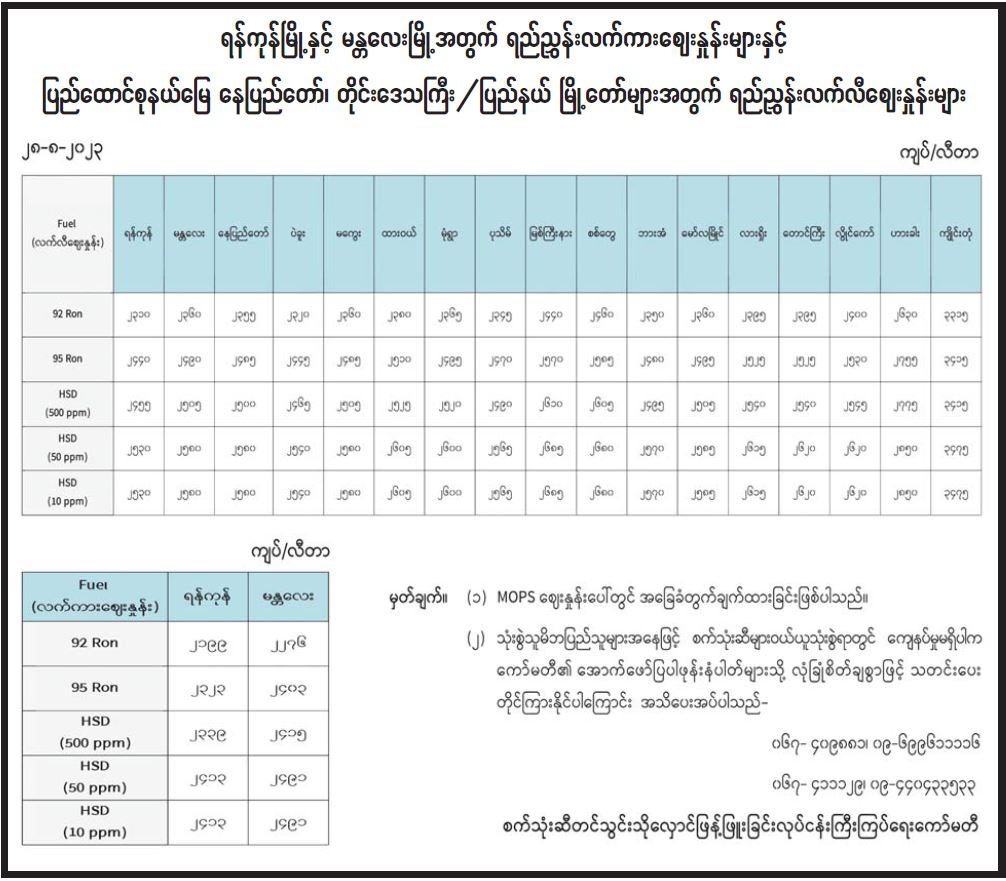 ရန်ကုန်မြို့နှင့် မန္တလေးမြို့အတွက် ရည်ညွှန်းလက်ကားဈေးနှုန်းများနှင့် ပြည်ထောင်စုနယ်မြေ နေပြည်တော်၊ တိုင်းဒေသကြီး/ပြည်နယ်မြို့တော်များအတွက် ရည်ညွှန်းလက်လီဈေးနှုန်းများ 08/28/2023