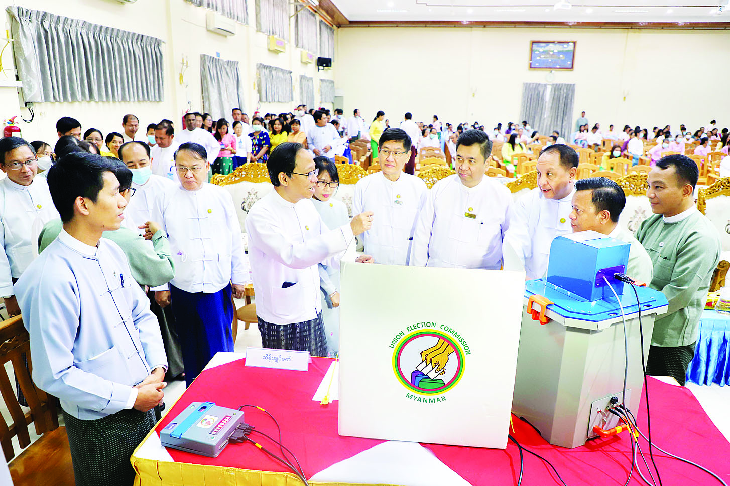 ဦးစွာ ပြည်ထောင်စုရွေးကောက်ပွဲကော်မရှင်အဖွဲ့ဝင် ဦးအောင်လွင်ဦးနှင့် ဦးကိုကိုလွင်၊ ပြည်ထောင်စုရွေးကောက်ပွဲကော်မရှင်ရုံးမှ တာဝန်ရှိသူများက မြန်မာအီလက်ထရောနစ် မဲပေးစက်နှင့်စပ်လျဉ်း၍ ရှင်းလင်းဆွေးနွေးပြီး စမ်းသပ်မဲပေးခြင်းများကို ဆောင်ရွက်ကြသည်။
