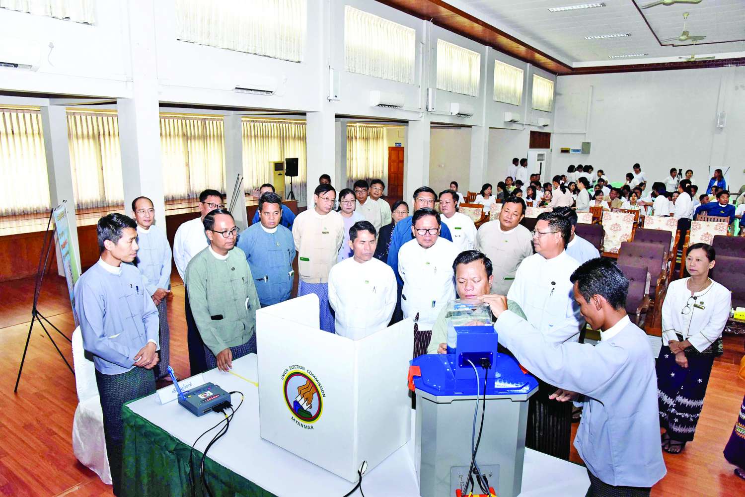 ဦးစွာ ပြည်ထောင်စုရွေးကောက်ပွဲကော်မရှင်အဖွဲ့ဝင် ဦးအောင်လွင်ဦးနှင့် ဦးကိုကိုလွင်၊ ပြည်ထောင်စုရွေးကောက်ပွဲကော်မရှင်ရုံးမှ တာဝန်ရှိသူများက မြန်မာအီလက်ထရွန်နစ် မဲပေးစက်နှင့်စပ်လျဉ်း၍ ရှင်းလင်းဆွေးနွေးပြီး စမ်းသပ်မဲပေးခြင်းများကို ဆောင်ရွက်ကြသည်။