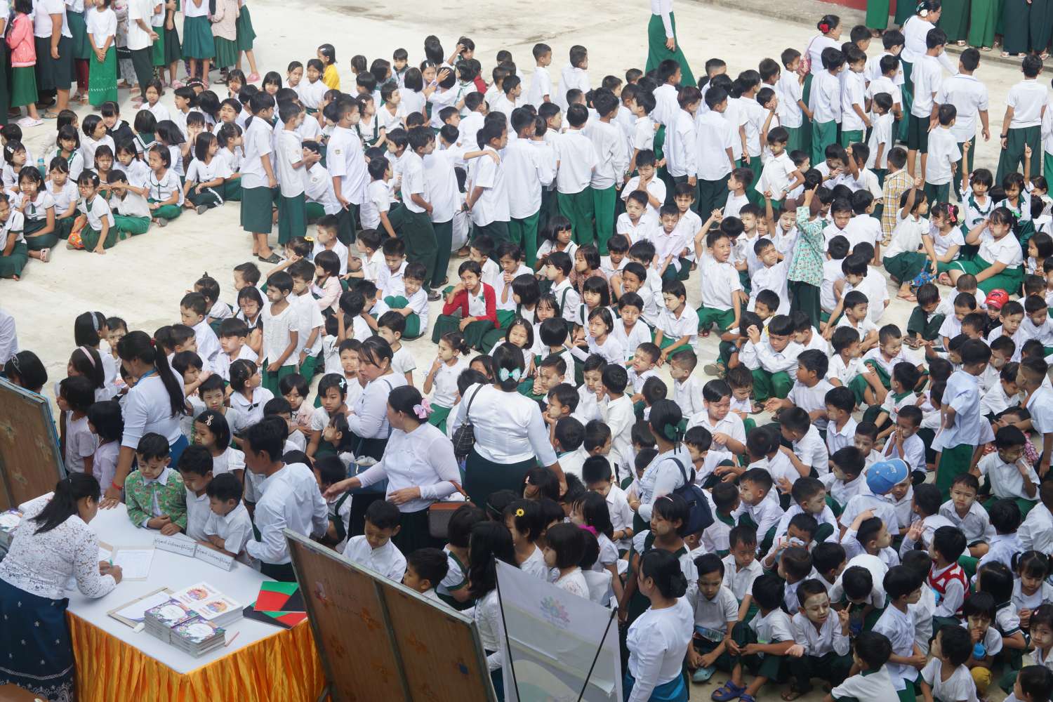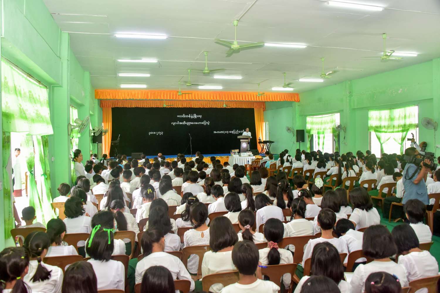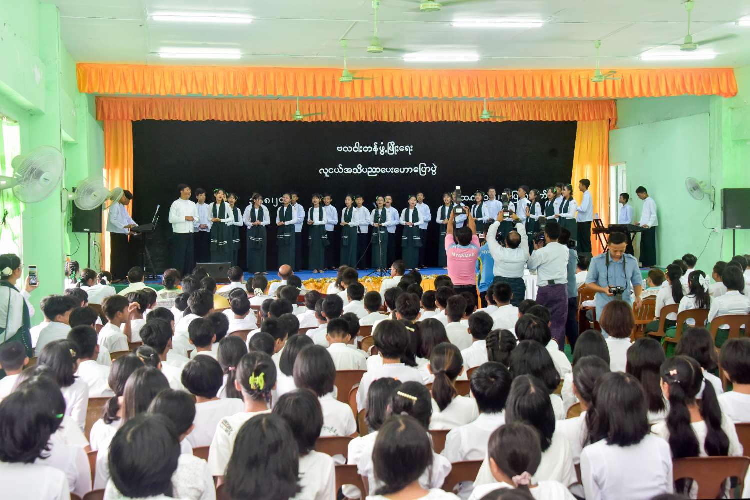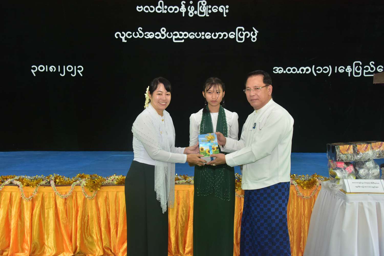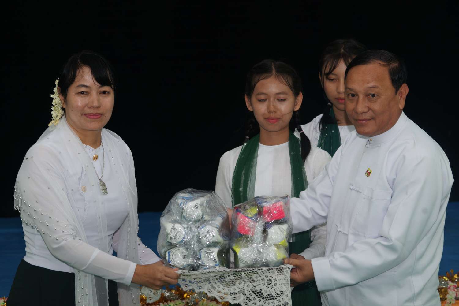 ယင်းနောက် ပြန်ကြားရေးဝန်ကြီးဌာန ပြည်ထောင်စုဝန်ကြီးနှင့် တာဝန်ရှိသူများက စာအုပ်စာစောင်များနှင့် အားကစားပစ္စည်းများကို ထောက်ပံ့ပေးအပ်ရာ ကျောင်းအုပ်ဆရာမကြီးမှ လက်ခံရယူသည်။