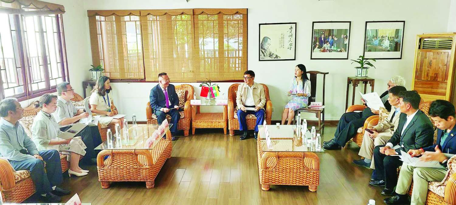 တရုတ်ပြည်သူ့သမ္မတနိုင်ငံ ကွေ့ကျိုးပြည်နယ် ကွေ့ရမ်မြို့တွင်ရောက်ရှိနေသော ပြည်ထောင်စုဝန်ကြီး ဒေါက်တာညွန့်ဖေဦးဆောင်သော မြန်မာကိုယ်စားလှယ်အဖွဲ့သည် ယနေ့နံနက်ပိုင်းက ကွေ့ကျိုးတက္ကသိုလ် (Guizhou University) သို့ သွားရောက်လေ့လာရာ တက္ကသိုလ်မှတာဝန်ရှိသူများက တက္ကသိုလ်ရှိစာကြည့်တိုက်၊ လက်တွေ့ခန်းများ၊ တက္ကသိုလ်သမိုင်းပြတိုက်နှင့် တက္ကသိုလ်အတွင်း လိုက်လံရှင်းလင်းပြသကြသည်။