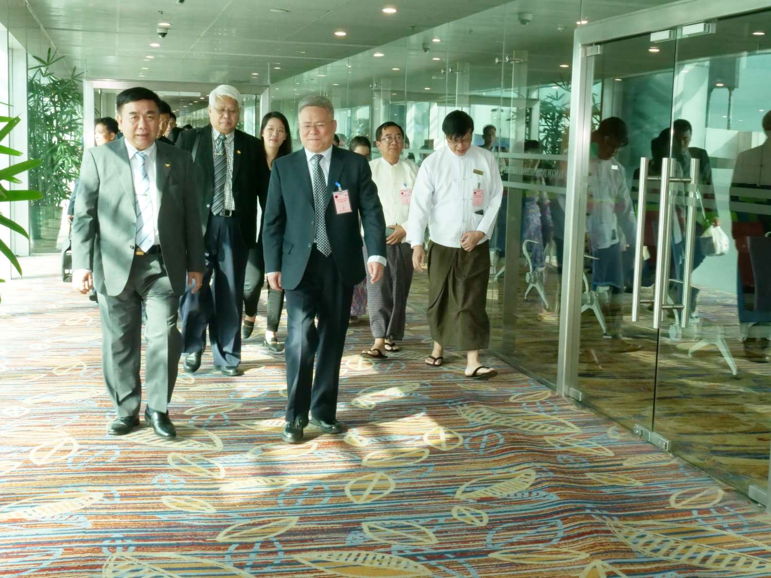 ပြည်ထောင်စုဝန်ကြီးဦးဆောင်သော မြန်မာကိုယ်စားလှယ်အဖွဲ့အား ပါမောက္ခချုပ်များနှင့် တာဝန်ရှိသူများ၊ မြန်မာနိုင်ငံဆိုင်ရာ တရုတ်ပြည်သူ့သမ္မတနိုင်ငံသံရုံးမှ တာဝန်ရှိသူများက ရန်ကုန်အပြည်ပြည်ဆိုင်ရာလေဆိပ်၌ ကြိုဆိုနှုတ်ဆက်ကြသည်။