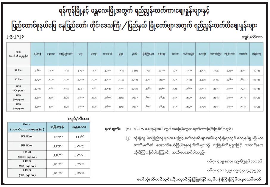 ရန်ကုန်မြို့နှင့် မန္တလေးမြို့အတွက် ရည်ညွှန်းလက်ကားဈေးနှုန်းများနှင့် ပြည်ထောင်စုနယ်မြေ နေပြည်တော်၊ တိုင်းဒေသကြီး/ပြည်နယ် မြို့တော်များအတွက် ရည်ညွှန်းလက်လီဈေးနှုန်းများ 09/02/2023