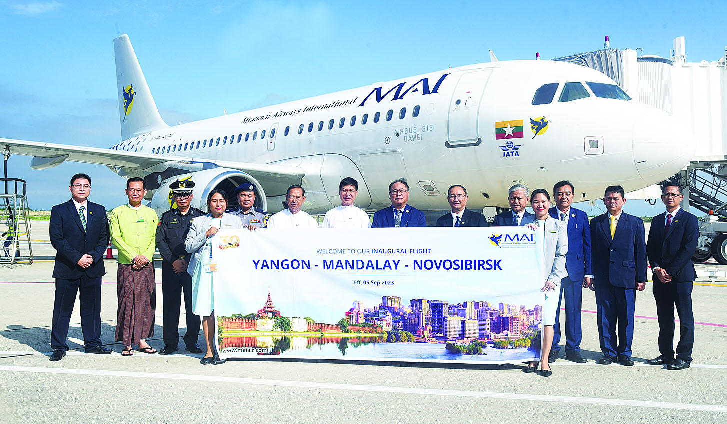 ရုရှားနိုင်ငံသို့ စတင်ပျံသန်းပြေးဆွဲသည့် အပြည်ပြည်ဆိုင်ရာ မြန်မာလေကြောင်း (MAI) သည် ရန်ကုန်အပြည်ပြည်ဆိုင်ရာလေဆိပ်မှ စက်တင်ဘာ ၅ ရက် မွန်းလွဲ ၂ နာရီ ၅ မိနစ်တွင် စတင်ထွက်ခွာခဲ့ပြီး မန္တလေးမြို့မှတစ်ဆင့် ရုရှားနိုင်ငံနိုဗိုဆီဘရစ်မြို့သို့ ထွက်ခွာခဲ့ခြင်းဖြစ်သည်။ အပြည်ပြည်ဆိုင်ရာ မြန်မာလေကြောင်း (MAI) သည် မန္တလေးမြို့မှရုရှားနိုင်ငံသို့မထွက်ခွာမီ မန္တလေးအပြည်ပြည်ဆိုင်ရာလေဆိပ်တွင် မန္တလေးတိုင်းဒေသကြီးဝန်ကြီးချုပ် ဦးမျိုးအောင်နှင့် တာဝန်ရှိသူများက ကြိုဆိုနှုတ်ဆက်ခဲ့ပြီး ပထမဆုံးခရီးစဉ်တွင် လိုက်ပါလာသူများကို ရင်းရင်းနှီးနှီးနှုတ်ဆက်ကာ အမှတ်တရစုပေါင်း ဓာတ်ပုံရိုက်ကူးကြသည်။