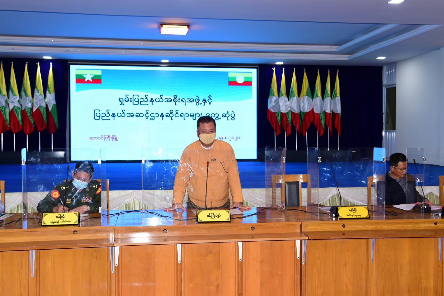 ရှမ်းပြည်နယ်အစိုးရအဖွဲ့၊ ပြည်နယ်ဝန်ကြီးချုပ် ဒေါက်တာလင်းထွဋ် က ယနေ့တက်ရောက်လာကြသည့် ဌာနဆိုင်ရာ အကြီးအကဲများနှင့် ဝန်ထမ်းများအားလုံးသည် နိုင်ငံ့ဝန်ထမ်းများဖြစ်သဖြင့် နိုင်ငံတော်မှခွင့်ပြုပေးသော လစာ၊ စရိတ်၊ ချီးမြှင့်ငွေများ၊ အဆောင်အယောင်များ ခံစားလျက်ရှိသူများဖြစ်ကြောင်း၊ မိမိတို့အနေဖြင့် မိမိတို့၏ တာဝန်ကျရာဒေသဖြစ်သော ရှမ်းပြည်နယ်ကြီး ဖွံ့ဖြိုးတိုးတက်ရေးအတွက် တက်ညီလက်ညီ အားကြိုးမာန်တက် တာဝန်ဝတ္တရားများ ကျေပွန်အောင် ထမ်းဆောင်ကြရမှာဖြစ်ကြောင်း၊ ရှမ်းပြည်နယ်ဖွံ့ဖြိုးတိုးတက်မှသာ နိုင်ငံတော်ဖွံ့ဖြိုးတိုးတက်မှုအတွက် အထောက်အကူပြု မှာဖြစ်ကြောင်း၊ ၂၀၂၀ ပြည့်နှစ် ဩဂုတ်လ ၈ ရက်နေ့တွင် နိုင်ငံတော်သမ္မတ က ရှမ်းပြည်နယ်(အရှေ့ပိုင်း)၊ ကျိုင်းတုံမြို့သို့ လာရောက်စဉ် နိုင်ငံဝန်ထမ်းများနှင့် တွေ့ဆုံပွဲ ပြုလုပ်ခဲ့ပြီး အဆိုပါအခမ်းအနား၌ နိုင်ငံတော်သမ္မတ က နိုင်ငံဝန်ထမ်းများ အနေဖြင့် တည်ဆဲဥပဒေများ၊ နိုင်ငံ့ဝန်ထမ်းဥပဒေ၊ နည်းဥပဒေများ၊ လုပ်ထုံးလုပ်နည်းများ၊ စည်းမျဉ်းစည်းကမ်းများကို လေးစားလိုက်နာပြီး စုပေါင်းမောင်းနှင်အားဖြင့် အကောင်းဆုံး ဆောင်ရွက်လျှင် ဒီမိုကရေစီနိုင်ငံတော်ကြီးကို တည်ထောင်ရာတွင် ပိုမိုလျှင်မြန်လွယ်ကူ နိုင်ပါကြောင်း၊ ဝန်ထမ်းများ၏ အရည်အသွေး ကောင်းမွန်သည်နှင့်အမျှ နိုင်ငံတော်ကြီး ပိုမို လျှင်မြန်စွာ တိုးတက်လာမည်ကို မိမိအပါအဝင် နိုင်ငံ့ဝန်ထမ်းများသည် နိုင်ငံတော်က ခွင့်ပြုပေးသည့် လစာများ၊ စရိတ်များ၊ အဆောင်အယောင်များကို ခံစားကြသည့် ဝန်ထမ်းများအားလုံး လေးလေးနက်နက် သိရှိရန်လိုအပ်ပါကြောင်း၊ နိုင်ငံသားအားလုံး၊ တိုင်းရင်းသားညီအစ်ကို မောင်နှမများအားလုံး တရားမျှတမှုကို ခံစားပိုင်ခွင့်ရရှိရန် လိုအပ်ပါကြောင်း၊ တရားမျှတစွာနှင့် ကိုယ်ချင်းစာစိတ်များဖြင့် ဆောင်ရွက်မှသာလျှင် ဒီမိုကရေစီစနစ်ကြီး ခိုင်မာအားကောင်းနိုင်မည်ဖြစ်ကြောင်း လမ်းညွှန်မှာကြား ခဲ့သည့်အတွက် ဌာနဆိုင်ရာအကြီးအကဲများအနေဖြင့် မိမိတို့လုပ်ငန်းများ ဆောင်ရွက်ရာတွင် မူအဖြစ် လိုက်နာကျင့်သုံးကြ ရန်လိုသကဲ့သို့ မိမိလက်အောက်ရှိ ဝန်ထမ်းများကိုလည်း ချပြရှင်းလင်းဆောင်ရွက်သွားကြရန် မှာကြားလိုကြောင်း ပြောကြားသွားသည်။