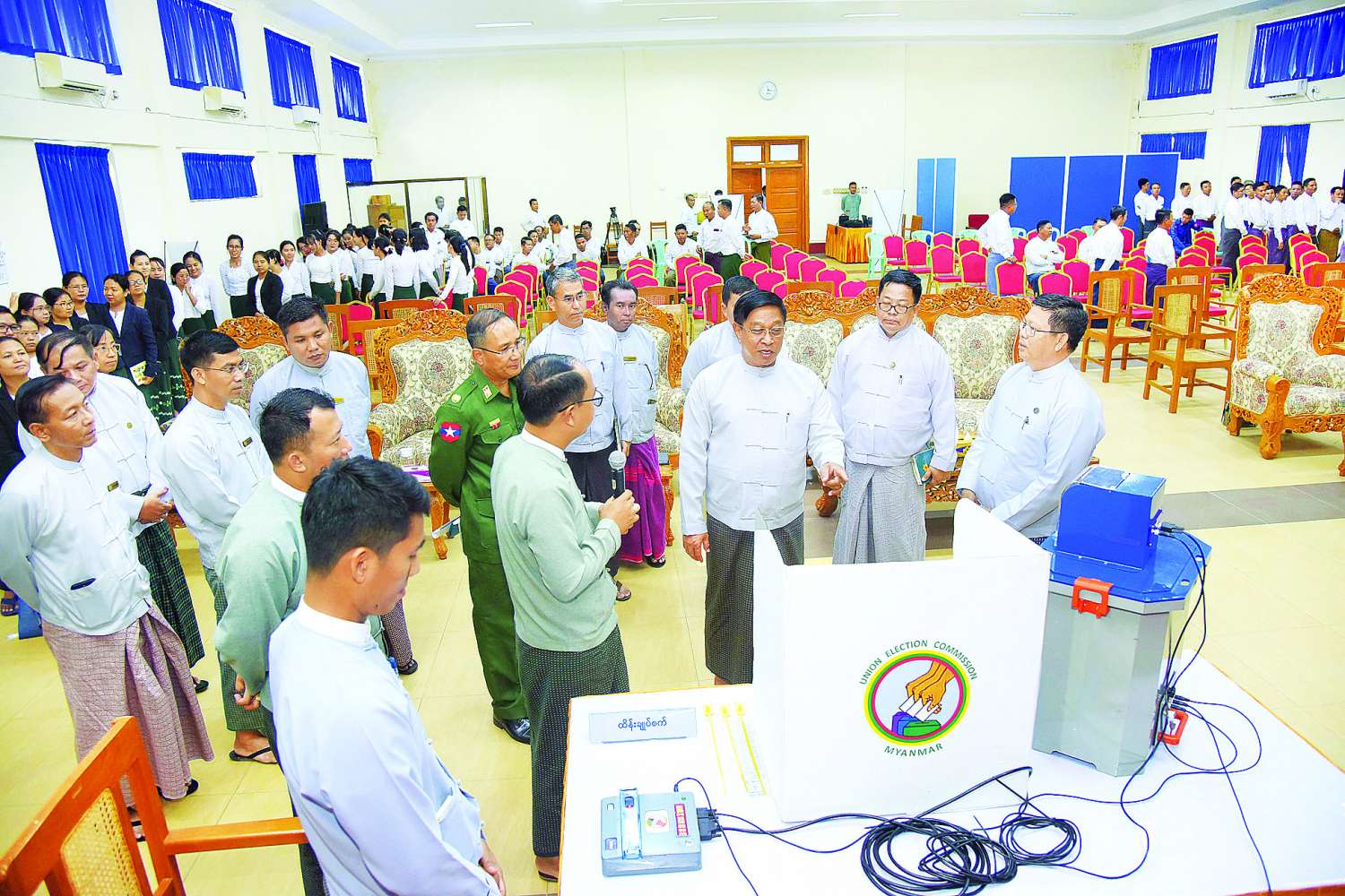 ပြည်ထောင်စုရွေးကောက်ပွဲကော်မရှင်က မြန်မာအီလက်ထရောနစ်မဲပေးစက်နှင့် စပ်လျဉ်း၍ ရှင်းလင်းပြသခြင်းနှင့် လက်တွေ့သရုပ်ပြ စမ်းသပ်မဲပေးခြင်းကို ယနေ့နံနက်ပိုင်းတွင် ကာကွယ်ရေးဝန်ကြီးဌာန အစည်းအဝေးခန်းမ၌ကျင်းပရာ နိုင်ငံတော်စီမံအုပ်ချုပ်ရေးကောင်စီအဖွဲ့ဝင်၊ ဒုတိယဝန်ကြီးချုပ်နှင့် ကာကွယ်ရေးဝန်ကြီးဌာန ပြည်ထောင်စုဝန်ကြီး ဗိုလ်ချုပ်ကြီးတင်အောင်စန်း၊ ဒုတိယဝန်ကြီး ဗိုလ်ချုပ်အောင်လင်းထွန်းနှင့် ကာကွယ်ရေးဝန်ကြီးဌာနမှ အရာထမ်း၊ အမှုထမ်းများ တက်ရောက်ကြသည်။