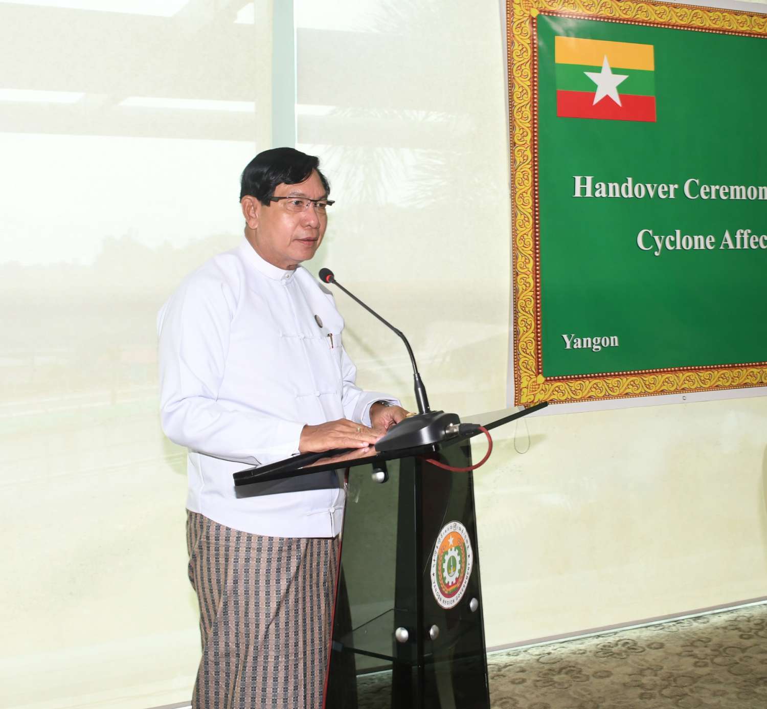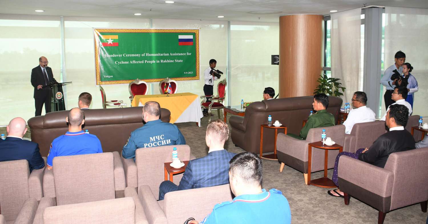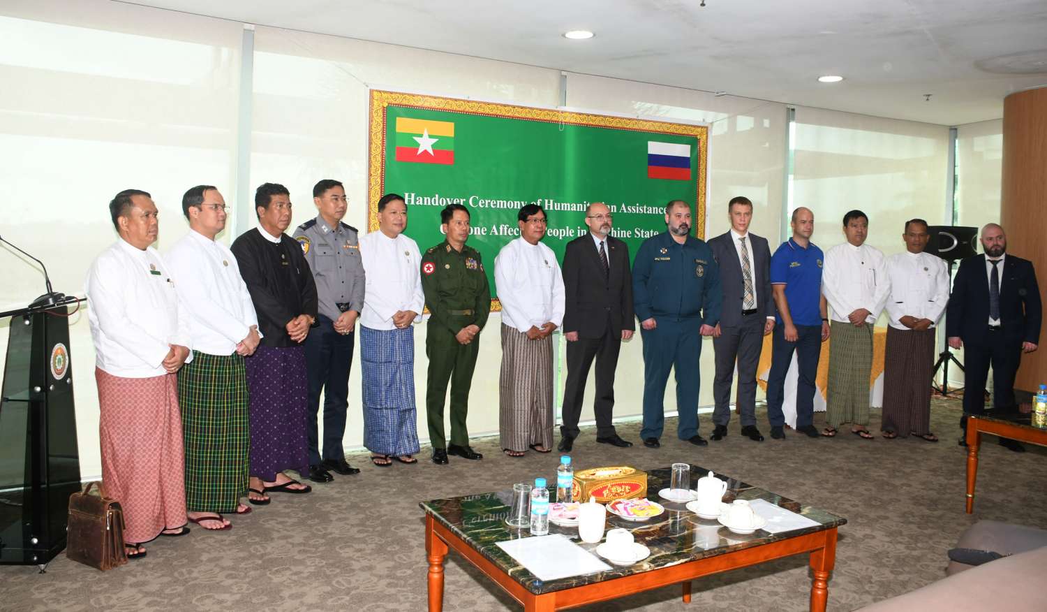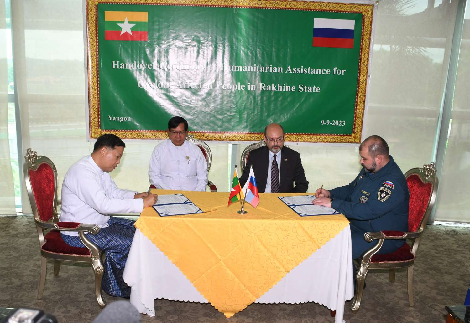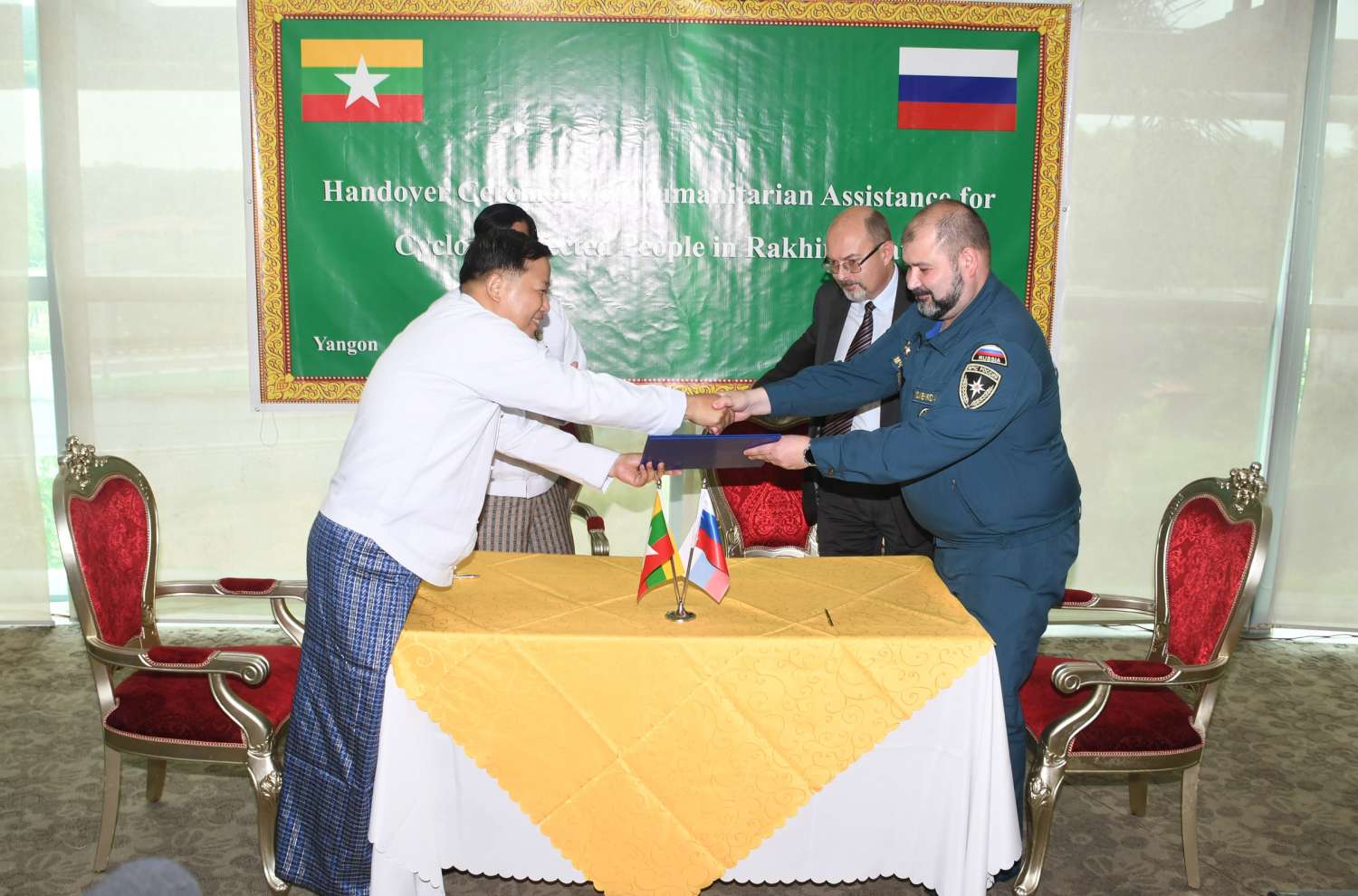 ထို့နောက် ရန်ကုန်တိုင်းဒေသကြီးအစိုးရအဖွဲ့ လူမှုရေးရာဝန်ကြီး ဦးအောင်ဝင်းသိန်းနှင့် ရုရှားနိုင်ငံ EMERCOM မှ Mr. Andrei KHOMENKO တို့က မိုခါဆိုင်ကလုန်း မုန်တိုင်းဘေးသင့်ပြည်သူများအတွက် လူသားချင်းစာနာမှု အကူအညီပစ္စည်းများကို လွှဲပြောင်းလက်ခံလက်မှတ်ရေးထိုးပြီး လဲလှယ်ကြသည်၊၊