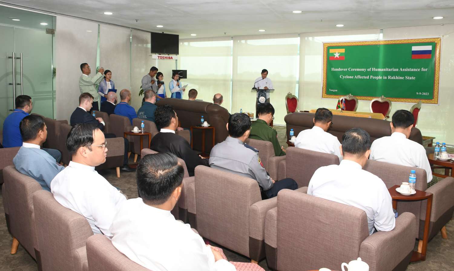 ထို့နောက် ရုရှားဖက်ဒရေးရှင်းနိုင်ငံမှ မိုခါဆိုင်ကလုန်းမုန်တိုင်း ဘေးသင့်ပြည်သူများအတွက် လူသားချင်းစာနာထောက်ထားမှုဆိုင်ရာ အကူအညီပစ္စည်းများ လွှဲပြောင်းပေးအပ်ပွဲကို နံနက်(၉)နာရီတွင် ရန်ကုန်အပြည်ပြည်ဆိုင်ရာ လေဆိပ်ဧည့်ခန်းမဆောင်၌ ကျင်းပသည်၊၊