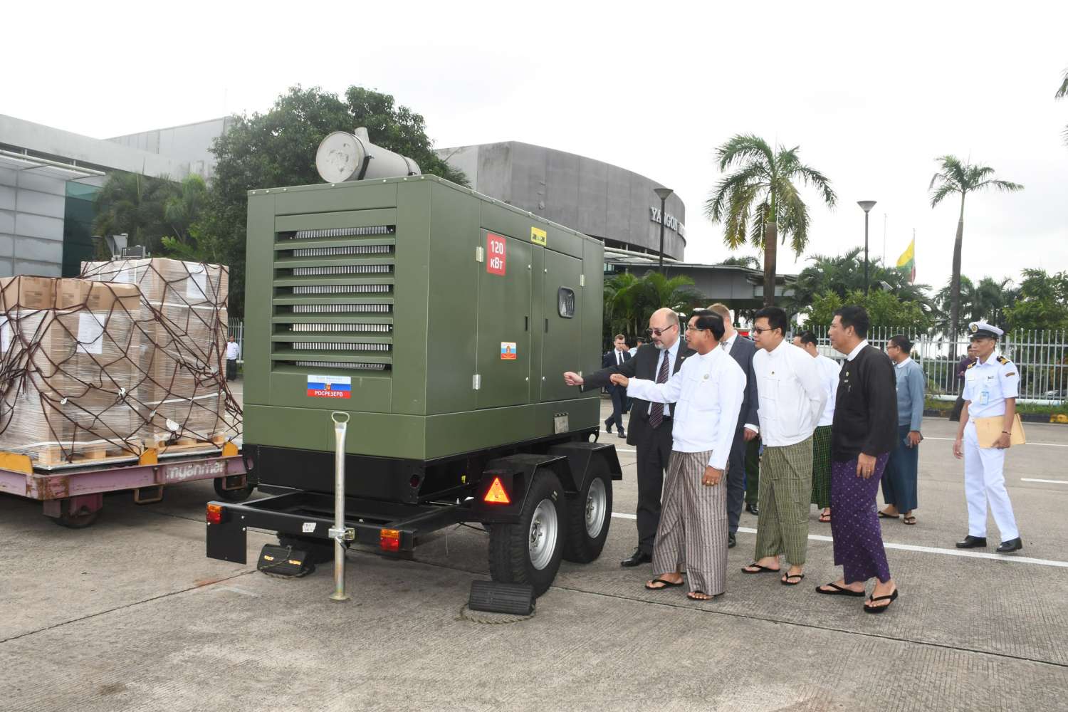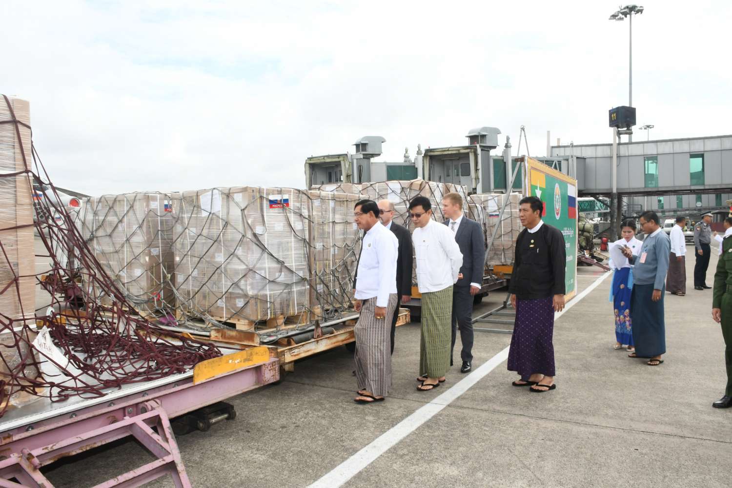 ဦးစွာ ရောက်ရှိလာသည့် အကူအညီပစ္စည်းများကို ရန်ကုန်တိုင်းဒေသကြီး သဘာဝဘေးအန္တရာယ်ဆိုင်ရာစီမံခန့်ခွဲမှုဦးစီးဌာန ညွှန်ကြားရေးမှူး ဦးသန်းစိုးနှင့် တာဝန်ရှိသူများ၊ မြန်မာနိုင်ငံဆိုင်ရာ ရုရှားဖက်ဒရေးရှင်းနိုင်ငံသံရုံးမှ တာဝန်ရှိသူတို့က ကြည့်ရှုစစ်ဆေးကြသည်၊၊