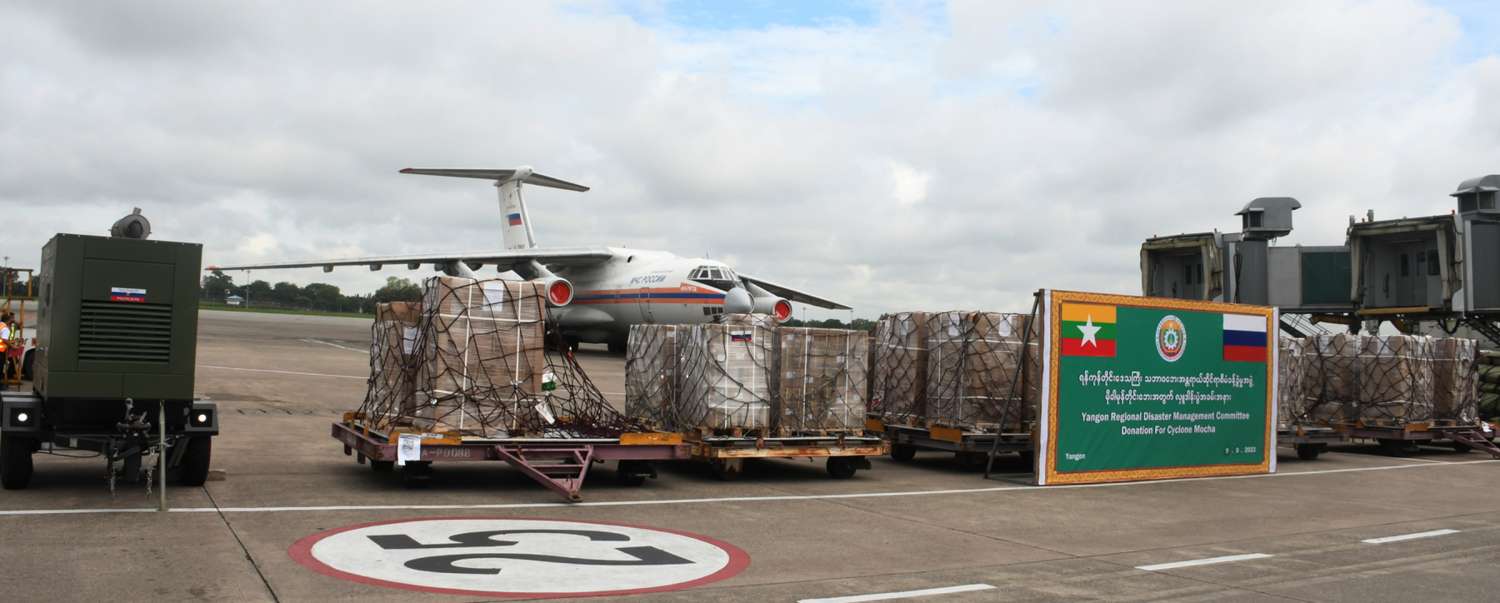 ရုရှား-မြန်မာ နှစ်နိုင်ငံချစ်ကြည်ရင်းနှီးမှုကို အခြေခံ၍ ရုရှားဖက်ဒရေးရှင်းနိုင်ငံကပေးအပ်သည့် မိုခါဆိုင်ကလုန်းမုန်တိုင်းဘေးသင့်ပြည်သူများအတွက် လူသားချင်းစာနာမှုအကူအညီပစ္စည်းများ တင်ဆောင်လာသော ရုရှားနိုင်ငံမှ ကုန်တင်လေယာဉ်သည် ယနေ့နံနက် ၄ နာရီ မိနစ် ၂၀ တွင် ရန်ကုန်အပြည်ပြည်ဆိုင်ရာလေဆိပ်သို့ ရောက်ရှိသည်၊၊
