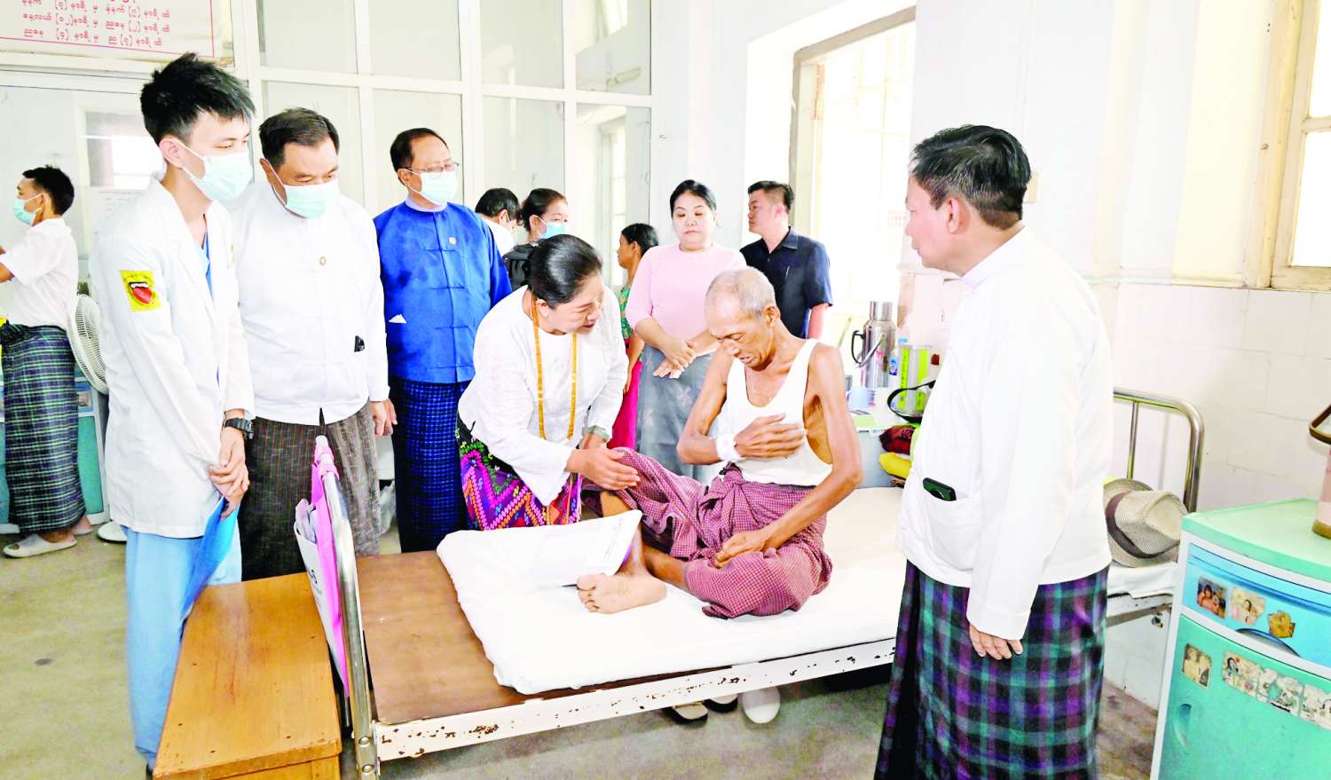 ဦးစွာ နိုင်ငံတော်စီမံအုပ်ချုပ်ရေးကောင်စီအဖွဲ့ဝင်နှင့်အဖွဲ့သည် ပြည်သူ့ဆေးရုံကြီးအတွင်း ဆေးဝါးကုသမှုခံယူနေသော လူနာများအား ရင်းရင်းနှီးနှီး လိုက်လံတွေ့ဆုံအားပေးစကားပြောကြားကာ ထောက်ပံ့ငွေနှင့် အာဟာရဖြစ် စားသောက်ဖွယ်ရာများကို ထောက်ပံ့ပေးအပ်ကြပြီး ဆေးရုံအတွက် ဆေးပဒေသာပင်ထောက်ပံ့ငွေများကို ပေးအပ်သည်။