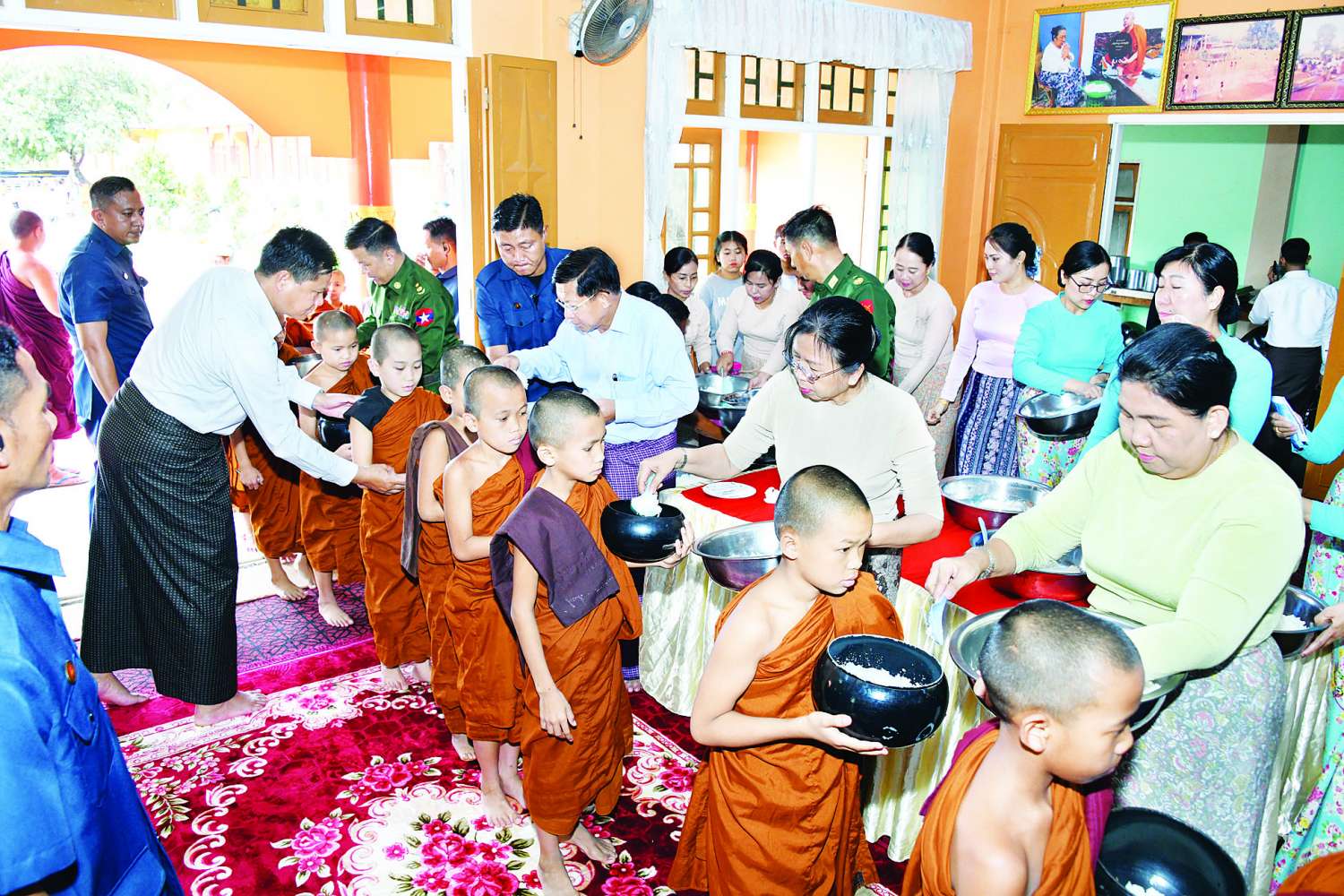 ထို့နောက် နိုင်ငံတော်စီမံအုပ်ချုပ်ရေးကောင်စီဥက္ကဋ္ဌ နိုင်ငံတော်ဝန်ကြီးချုပ်နှင့်ဇနီး၊ အဖွဲ့ဝင်များသည် သီရိမင်္ဂလာမန်ဆူရှမ်းကျောင်းတိုက်မှ စာသင်သားသံဃာတော်များနှင့် သာမဏေများအား နေ့ဆွမ်းလောင်းလှူခဲ့ကြပြီး သီရိမင်္ဂလာ မန်ဆူရှမ်းကျောင်းတိုက် ဆရာတော်ကြီးအမှူးပြုသည့် သံဃာတော်များအား နေ့ဆွမ်း ဆက်ကပ်လှူဒါန်းသည်။