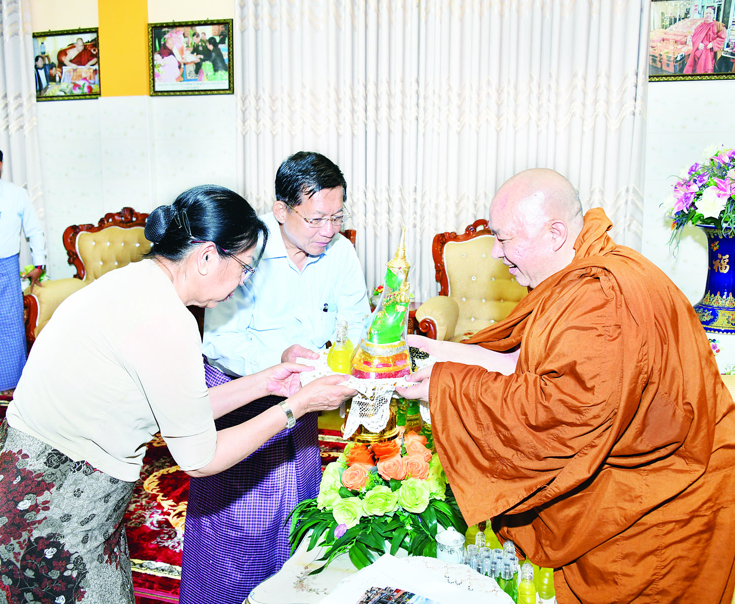 ထို့နောက် နိုင်ငံတော်စီမံအုပ်ချုပ်ရေးကောင်စီဥက္ကဋ္ဌ နိုင်ငံတော်ဝန်ကြီးချုပ်နှင့် ဇနီး တို့သည် သီရိမင်္ဂလာမန်ဆူရှမ်းကျောင်းတိုက် ဆရာတော်ကြီးအား ဖူးမြော်ကြည်ညိုပြီး မာရဝိဇယဗုဒ္ဓရုပ်ပွားတော်မြတ်ပုံစံတူ ကျောက်ဆစ်ဗုဒ္ဓရုပ်ပွားတော်မြတ်၊ ဆွမ်းဆန်တော်နှင့် လှူဖွယ်ပစ္စည်းများကို ဆက်ကပ်လှူဒါန်းသည်။