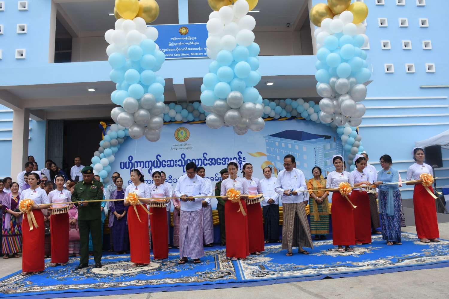 ဦးစွာ ပြည်ထောင်စုဝန်ကြီး၊ ရန်ကုန်တိုင်းဒေသကြီးဝန်ကြီးချုပ်၊ ရန်ကုန်တိုင်းစစ်ဌာနချုပ်တိုင်းမှူး၊ ပြည်သူ့ကျန်းမာရေးဦးစီးဌာန ညွှန်ကြားရေးမှူးချုပ်တို့က ဗဟိုကာကွယ်ဆေးသိုလှောင်အအေးခန်း (၄) ထပ်ဆောင် အဆောက်အဦသစ်ကို ဖဲကြိုးဖြတ်၍ ဖွင့်လှစ်ပေးသည်။