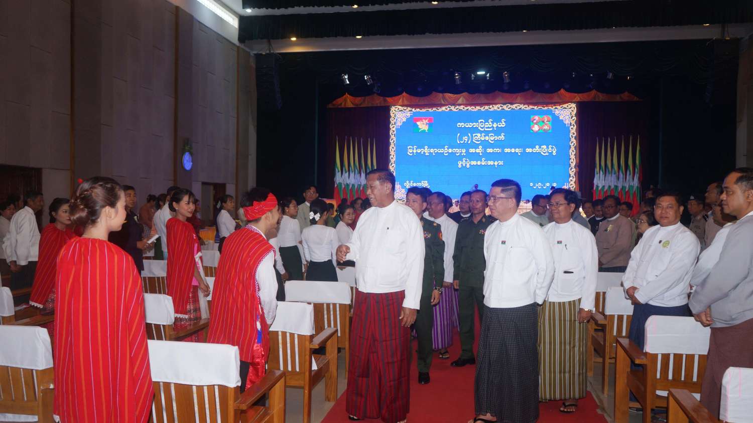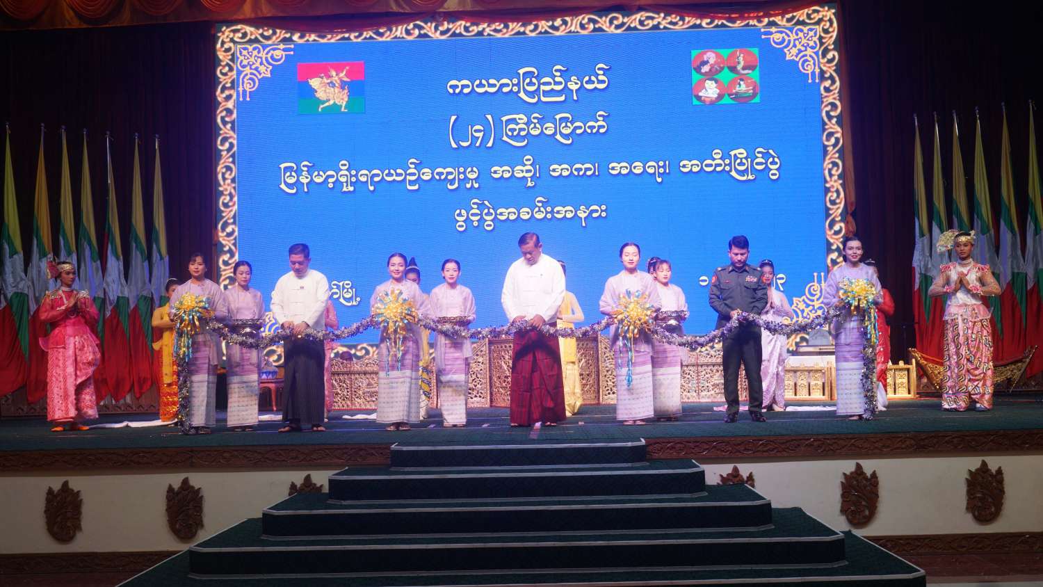 ရှေးဦးစွာ နိုင်ငံတော်စီမံအုပ်ချုပ်ရေးကောင်စီအဖွဲ့ဝင်၊ ပြည်နယ်ဝန်ကြီးချုပ်နှင့် ဒေသကွပ်ကဲရေးမှူးတို့က (၂၄)ကြိမ်မြောက် မြန်မာ့ရိုးရာယဉ်ကျေးမှု အဆို၊ အက၊ အရေး၊ အတီး ပြိုင်ပွဲ (ပြည်နယ်အဆင့်) ဖွင့်ပွဲအခမ်းအနားကို ဖဲကြိုးဖြတ်ဖွင့်လှစ်ပေးကြသည်။