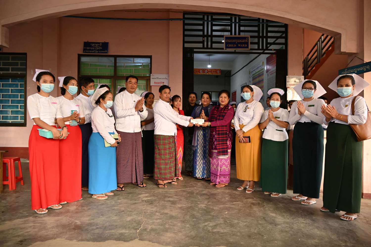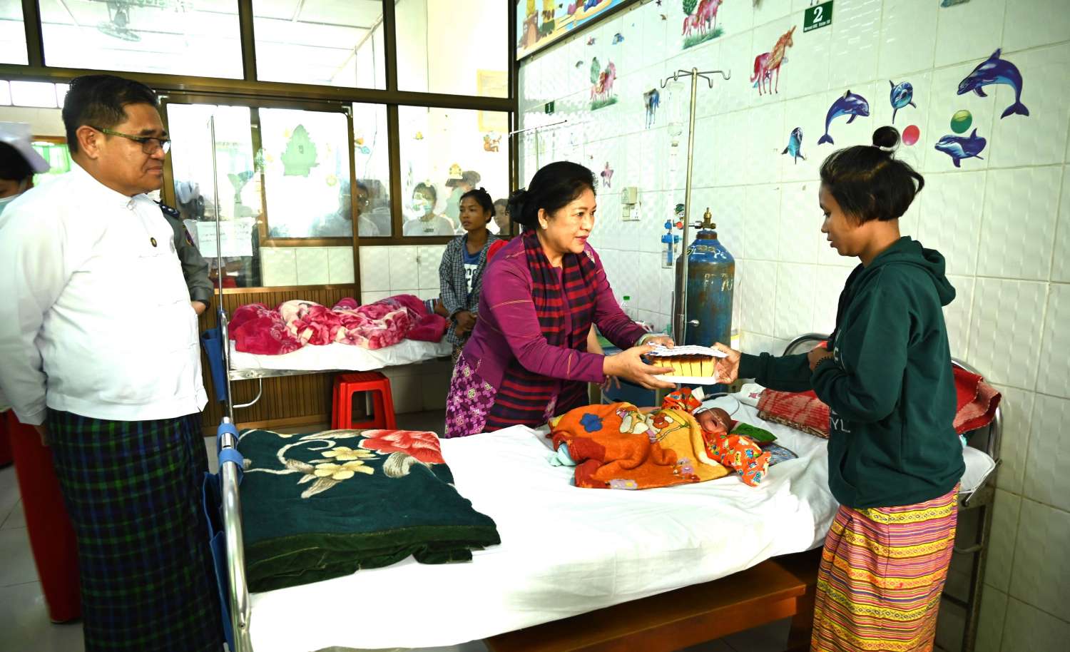 ထိုမှတစ်ဆင့် နိုင်ငံတော်စီမံအုပ်ချုပ်ရေးကောင်စီအဖွဲ့ဝင်နှင့်အဖွဲ့သည် ဗန်းမော်မြို့ ညောင်ပင်ရပ်ကွက်အတွင်းရှိ ဗန်းမော်ပြည်သူ့ဆေးရုံသို့သွားရောက်ပြီး ခရိုင်ပြည်သူ့ကျန်းမာရေးဦးစီးဌာနမှူး၊ ဆေးရုံအုပ်၊ တာဝန်ရှိသူများနှင့်အတူ ဆေးရုံကြီးကလေးဖျားနာကုသဆောင်အတွင်း တက်ရောက်ဆေးဝါးကုသမှုခံယူနေသော ကလေးငယ်များနှင့် မိခင်များအား ရင်းရင်းနှီးနှီး လိုက်လံနှုတ်ဆက်၍ အားပေးစကားများပြောကြားကြကာ ထောက်ပံ့ငွေများနှင့် အာဟာရဖြစ်မုန့်များကို ထောက်ပံ့ပေးအပ်ခဲ့ကြကြောင်း သိရသည်။