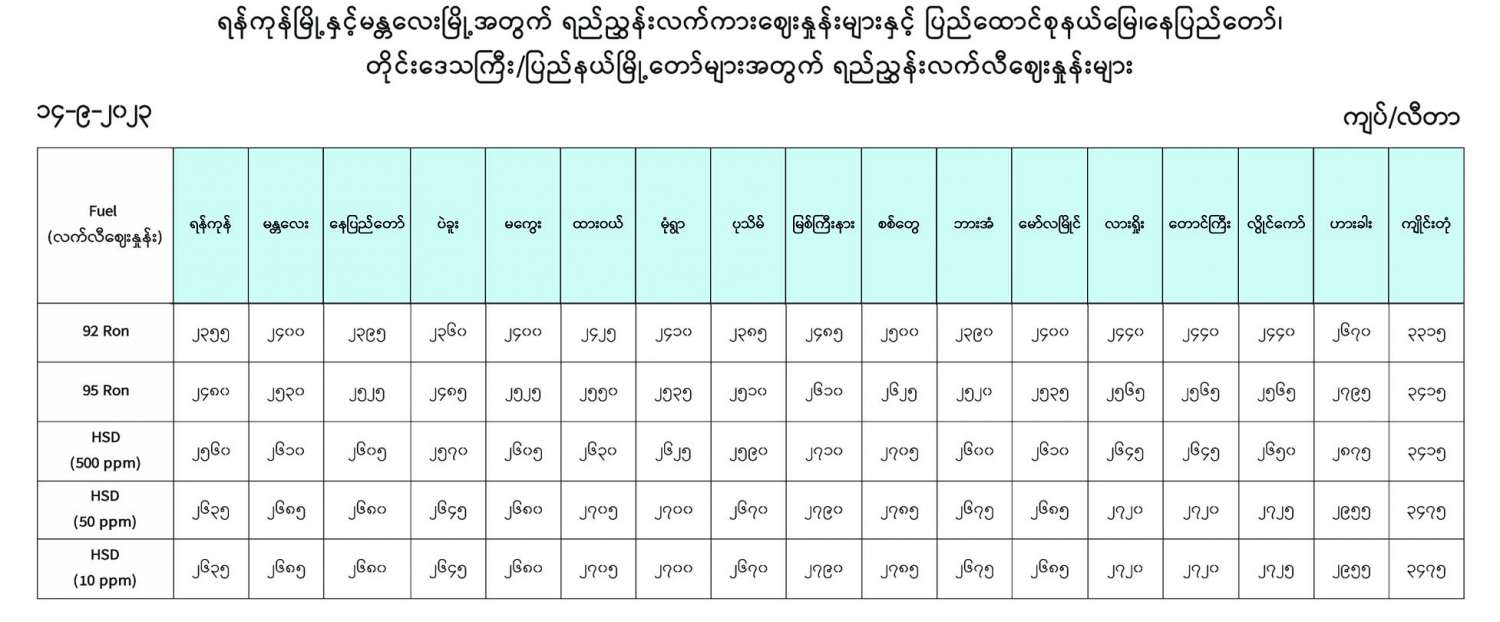ရန်ကုန်မြို့နှင့် မန္တလေးမြို့အတွက် ရည်ညွှန်းလက်ကားဈေးနှုန်းများနှင့် ပြည်ထောင်စုနယ်မြေ နေပြည်တော်၊ တိုင်းဒေသကြီး/ ပြည်နယ် မြို့တော်များအတွက် ရည်ညွှန်းလက်လီဈေးနှုန်းများ 09/14/2023