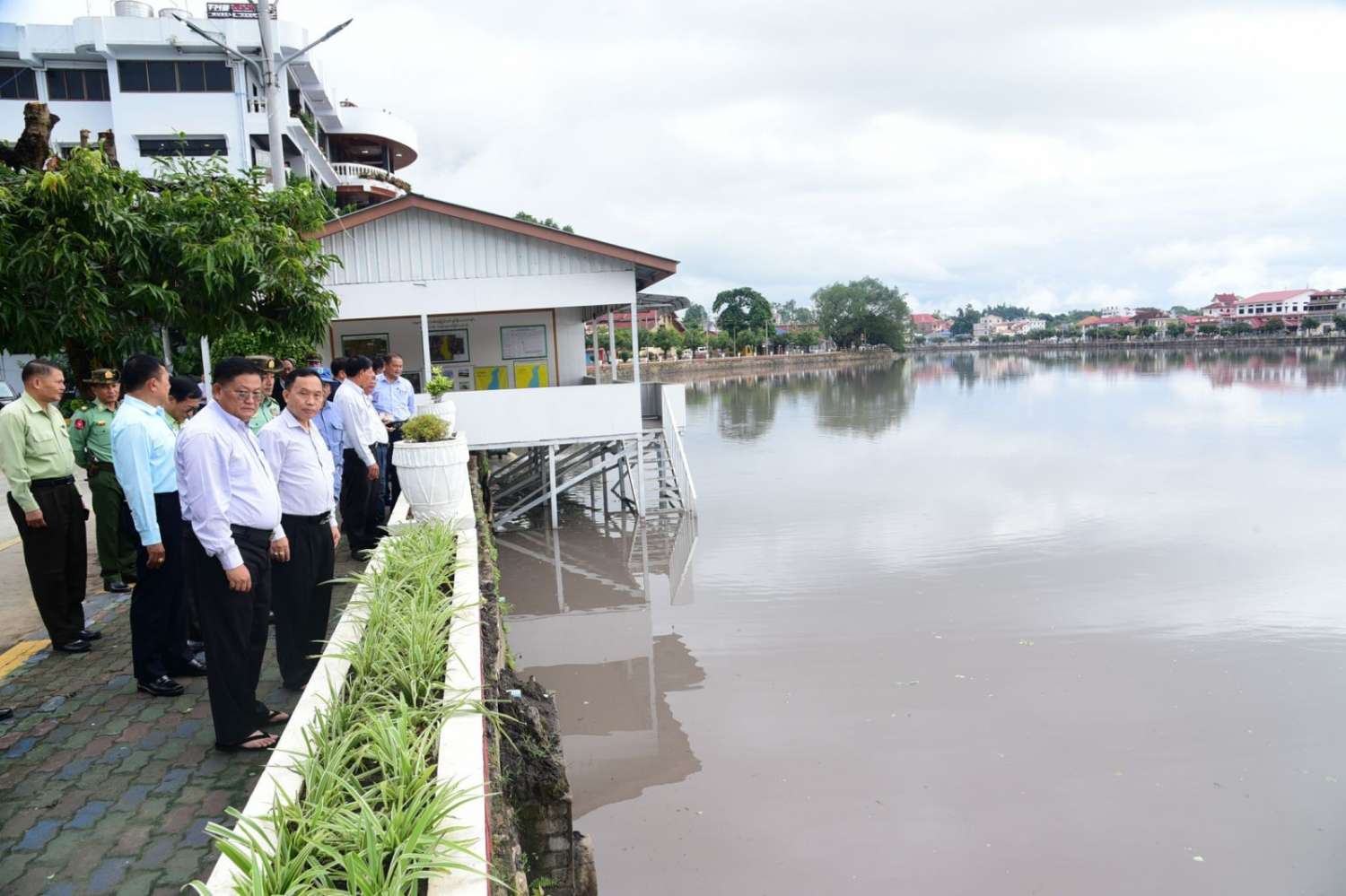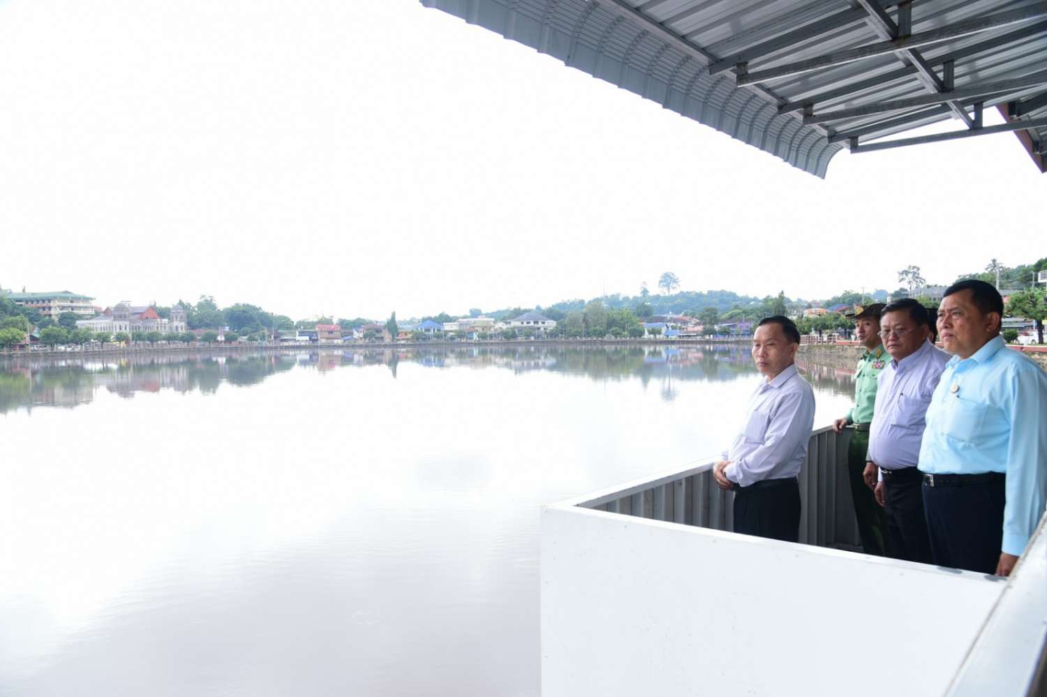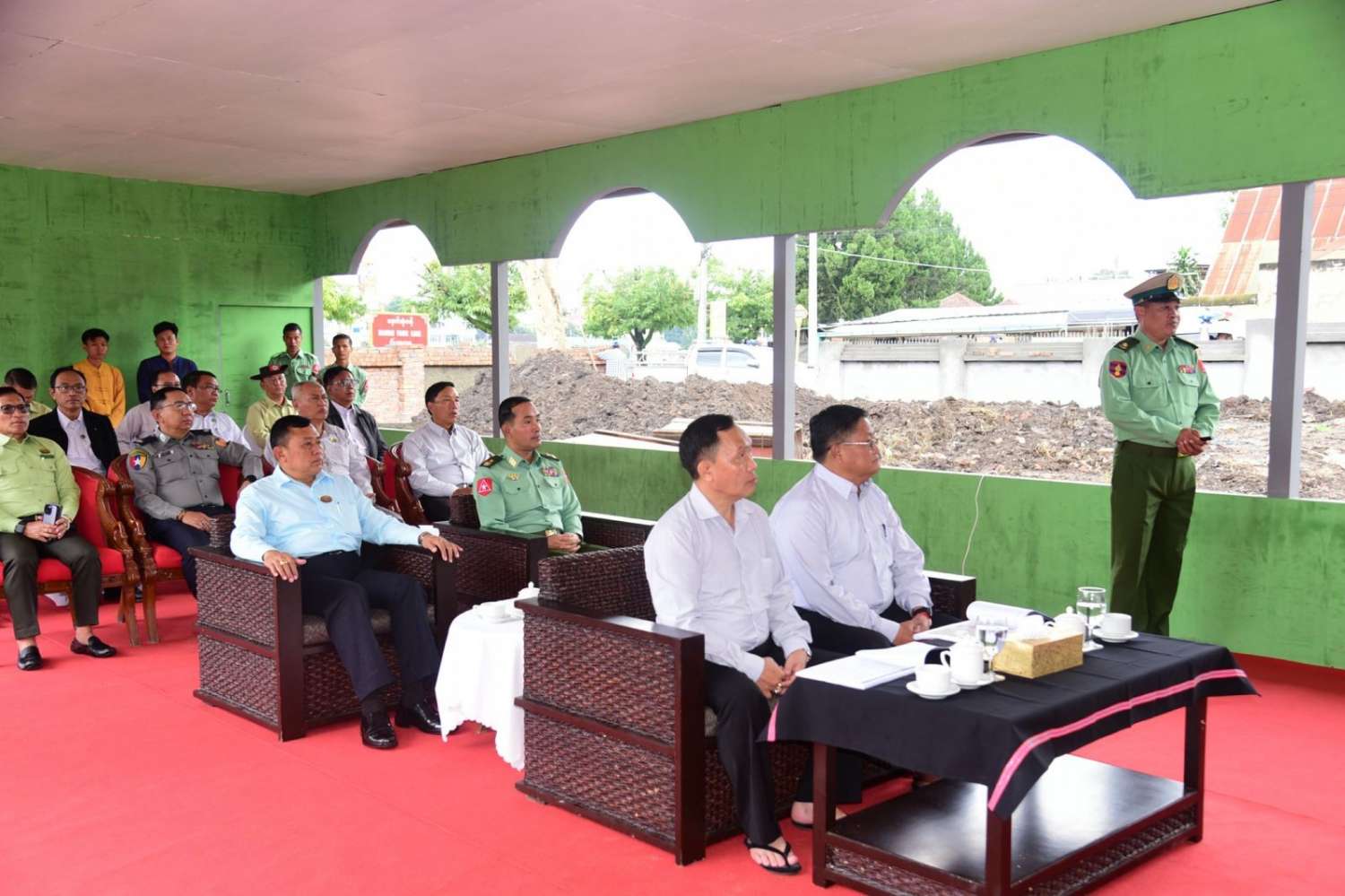 ထို့နောက် ယနေ့နံနက်ပိုင်းတွင် ကျိုင်းတုံမြို့နောင်တုံကန်နှင့် ကျိုင်းတုံဟော်နန်းသံကူ ကွန်ကရိ(၂)ထပ်ဆောင် တည်ဆောက်နေမှုအားကြည့်ရှုရာ နယ်မြေခံဆောက်လုပ်ရေး အင်ဂျင်နီယာတပ်ခွဲမှ တာဝန်ရှိသူတစ်ဦးမှရှင်းလင်း၍ ဟော်နန်းအတွင်း လှည့်လည်ကြည့်ရှုကြသည်။
