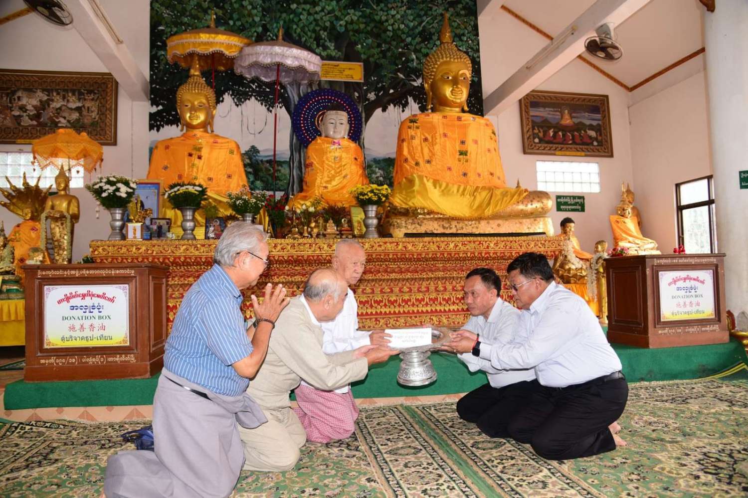 ဆက်လက်၍ ဝမ်ဆိုင်းဘုန်းတော်ကြီးကျောင်းအားသွားရောက်၍ ကျောင်းရှိဆရာတော်အား ဖူးမျှော်ကန်တော့၍ နဝကမ္မအလှူငွေများ ဆက်ကပ်လှူဒါန်းပေးကြသည်။