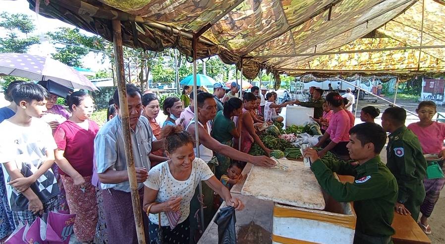 ဆိုင်ကလုန်းမုန်တိုင်း(မိုခါ)တိုက်ခတ်မှုကြောင့် မုန်တိုင်းဒဏ်သင့်ဒေသခံပြည်သူများနှင့် ဌာနဆိုင်ရာဝန်ထမ်းများ၏ စားသောက်ရေးအဆင်ပြေစေရန်နှင့် စားသောက်ကုန်ပစ္စည်းများကို ဈေးနှုန်းသက်သာစွာဖြင့် ဝယ်ယူစားသောက်နိုင်ရေးအတွက် အနောက်ပိုင်းတိုင်းစစ်ဌာနချုပ်၊ နယ်မြေခံတပ်မတော်သားများနှင့် တာဝန်ရှိသူများက နေ့စဉ်ရောင်းချပေးလျက်ရှိသည်။