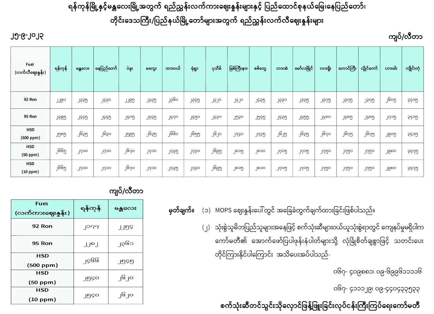 ရန်ကုန်မြို့နှင့် မန္တလေးမြို့အတွက် ရည်ညွှန်းလက်ကားဈေးနှုန်းများနှင့် ပြည်ထောင်စုနယ်မြေ နေပြည်တော်၊ တိုင်းဒေသကြီး/ပြည်နယ် မြို့တော်များအတွက် ရည်ညွှန်းလက်လီဈေးနှုန်းများ 09/25/2023
