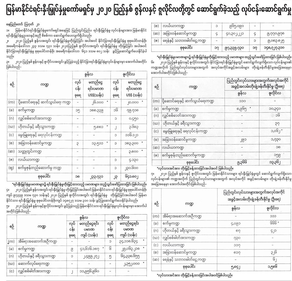 ၂။ ၂၀၂၀ ပြည့်နှစ် ဇွန်လအတွင်း ရင်းနှီးမြှုပ်နှံမှုတိုးမြှင့်ခြင်း အပါအဝင် နိုင်ငံခြားရင်းနှီးမြှုပ်နှံမှု စုစုပေါင်းတန်ဖိုး အမေရိကန်ဒေါ်လာ ၂၃၃ ဒသမ ၇၃၁ သန်း၊ ၂၀၂၀ပြည့်နှစ် ဇူလိုင်လအတွင်း ရင်းနှီးမြှုပ်နှံမှု တိုးမြှင့်ခြင်း အပါအဝင် နိုင်ငံခြားရင်းနှီးမြှုပ်နှံမှု စုစုပေါင်းတန်ဖိုး အမေရိကန်ဒေါ်လာ ၆၄၁ ဒသမ ၈၀၂ သန်း ခွင့်ပြုဆောင်ရွက်ပေးနိုင်ခဲ့ပါ သည်။