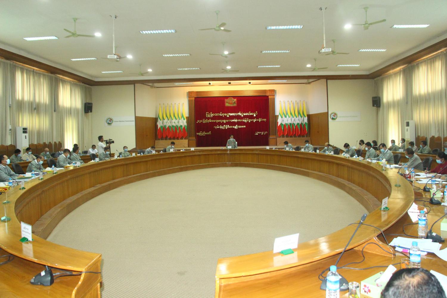 ထို့နောက် တိုင်းဒေသကြီး/ ပြည်နယ်၊ ပြည်ထောင်စုနယ်မြေ ရွေးကောက်ပွဲ ကော်မရှင်အဖွဲ့ခွဲ များမှ တာဝန်ရှိသူများက လွှတ်တော် ကိုယ်စားလှယ်လောင်း အမည်စာရင်း တင်သွင်းခြင်း၊ စိစစ်ခြင်း၊ မဲဆန္ဒရှင်စာရင်းများ ပြင်ဆင်ဆောင်ရွက်ခြင်း၊ မဲရုံများလျာထား သတ်မှတ်ခြင်း တို့နှင့်စပ်လျဉ်း၍ ဆောင်ရွက်ထားရှိမှု အခြေအနေများကို ရှင်းလင်းတင်ပြ သည်။ တင်ပြချက်များအပေါ် ပြည်ထောင်စု ရွေးကောက်ပွဲကော်မရှင်ဥက္ကဋ္ဌ၊ ကော်မရှင်အဖွဲ့ဝင်များနှင့် ကော်မရှင်ရုံးမှတာဝန်ရှိသူများက အကြံပြုဆွေးနွေး ခဲ့ကြသည်။